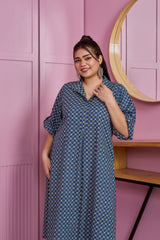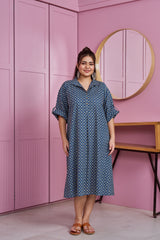 Dark Blue Printed Cotton Shirt Dress