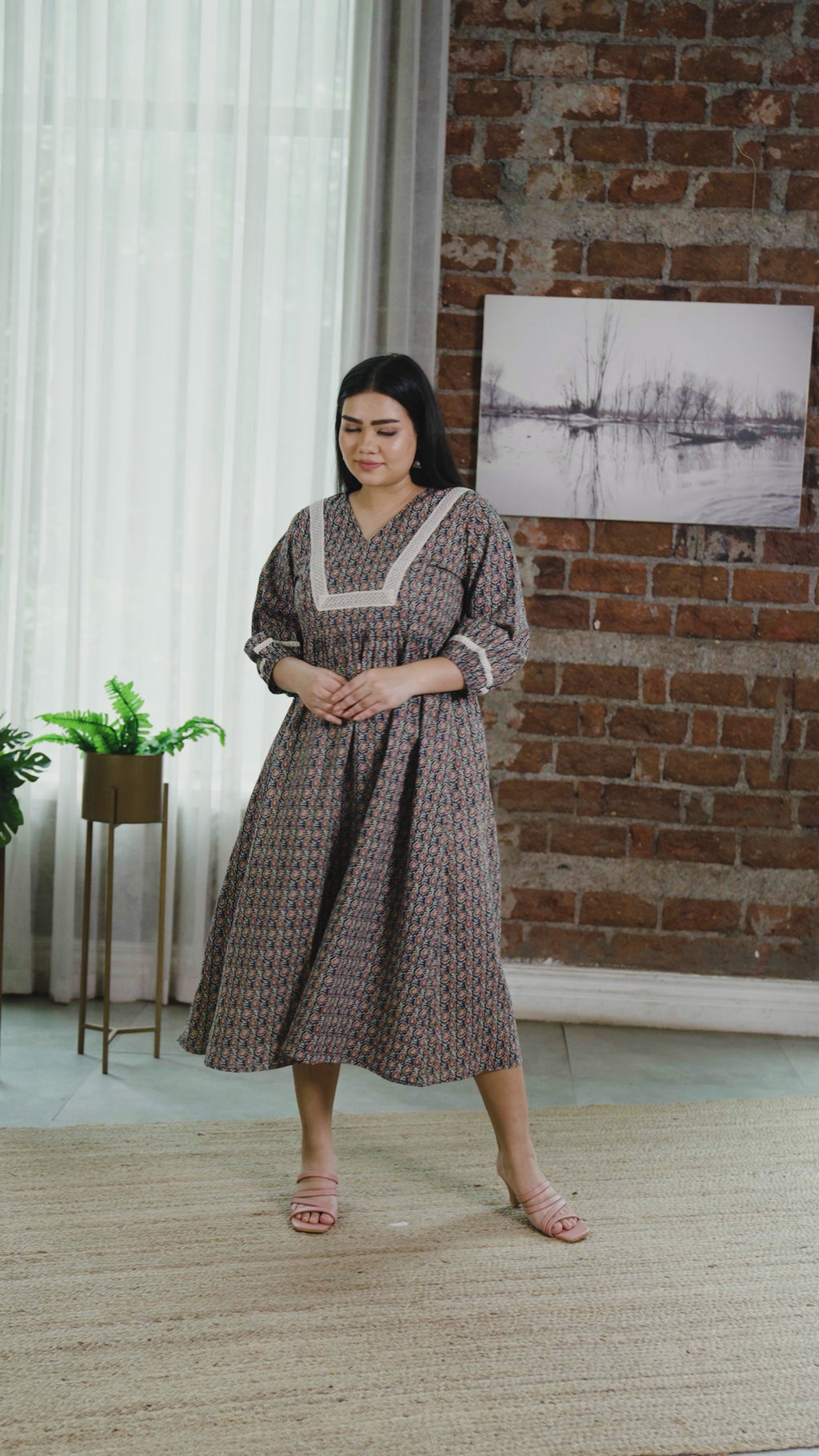 Embrace effortlessly with this Earthy Paisley Print Midi Dress. Crafted from lightweight fabric, this fit-and-flare dress is accentuated by a V-neckline, cinched waist, playful puffed sleeves, and contrasting crochet lace detailing. Perfect for transitioning from office to evening.