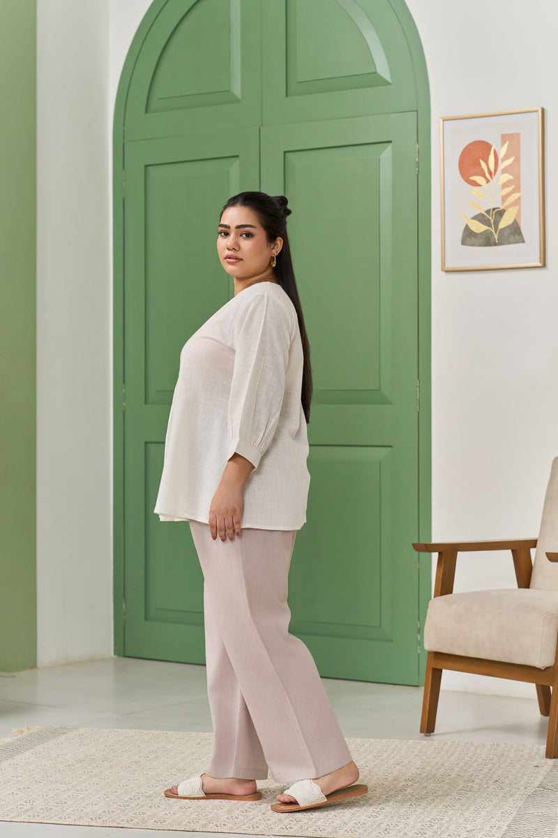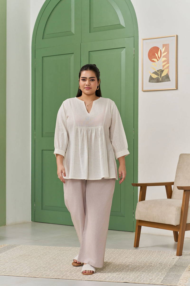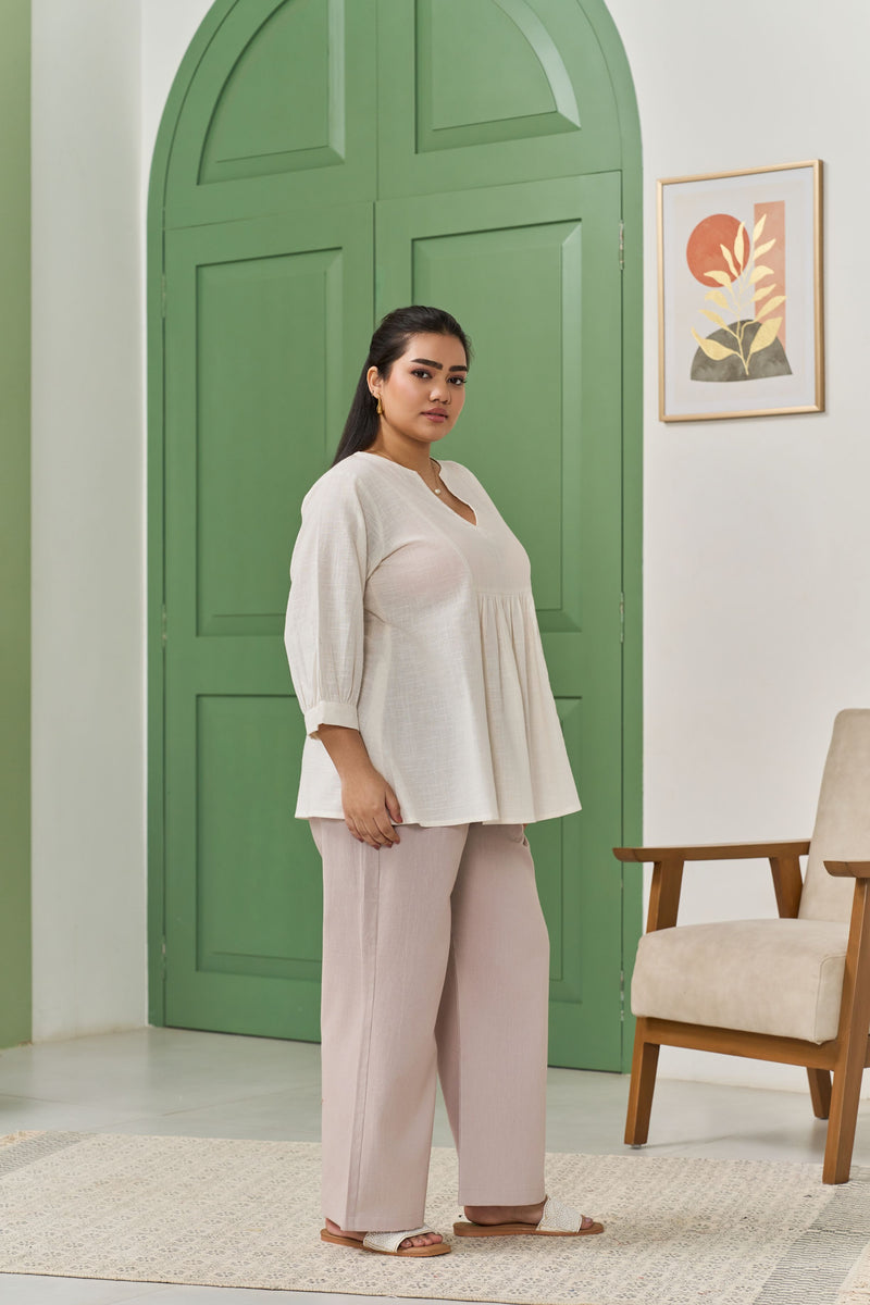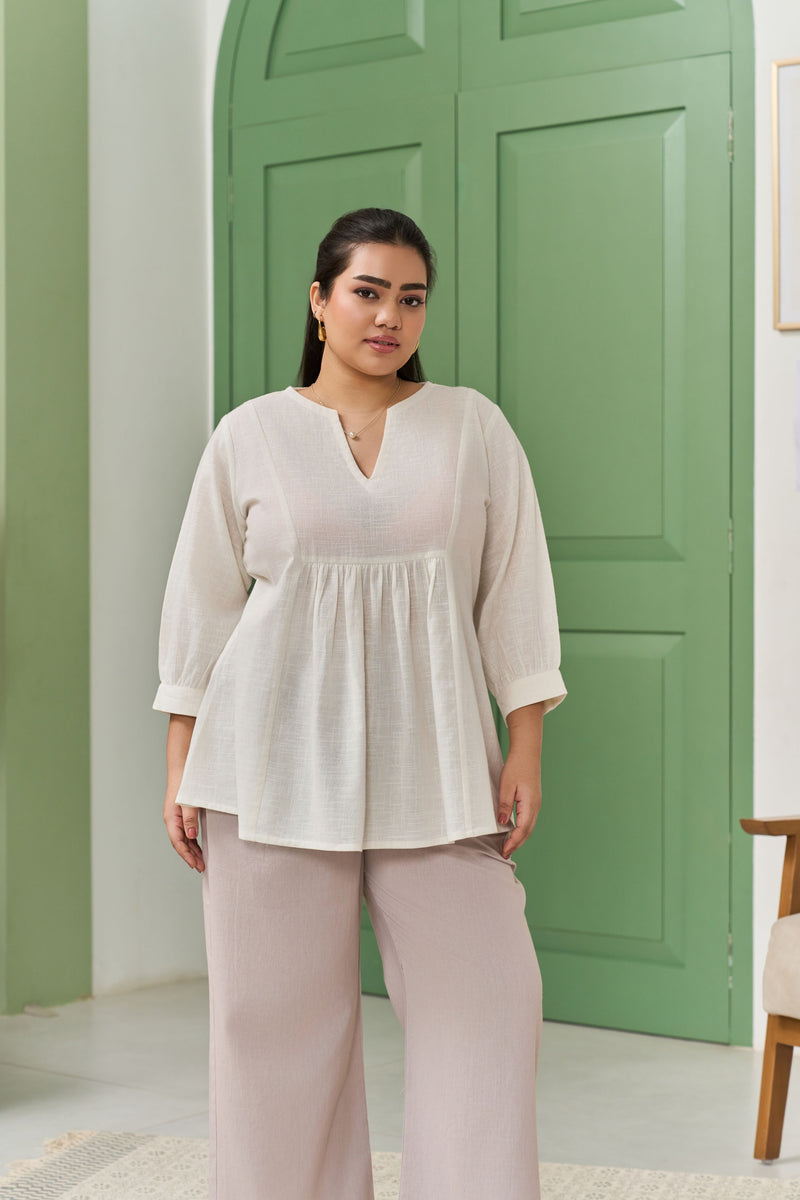 breathable cotton slub fabric, offering a soft, textured feel with a relaxed yet structured silhouette. The flattering peplum flare enhances your natural shape, adding a touch of femininity and movement to your look. Designed for both comfort and style, this versatile top is perfect for casual outings or dressed-up occasions.