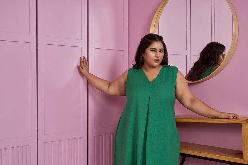 Effortlessly stylish and practical, our Emerald Green Center-Pleated Short Dress is a wardrobe essential. Made from breathable flex cotton fabric, it ensures all-day comfort while keeping you looking sharp. The V-neckline adds a modern touch, and the central pleat detail creates a polished, structured silhouette. Perfect for casual outings or a day at work.