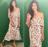 It's a floral hand block printed off shoulder dress in cotton with a ruffle layer detail on the front bodice and side slit.