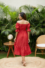 This is a red Geometric print dress with smocked yolk and has a very good fit. It is attached with a tier to give that sassay look with cute elasticated sleeves. Be a a party stopper in this sensuous red dress and steal the show with your looks. The dress can be worn on or off the shoulders.