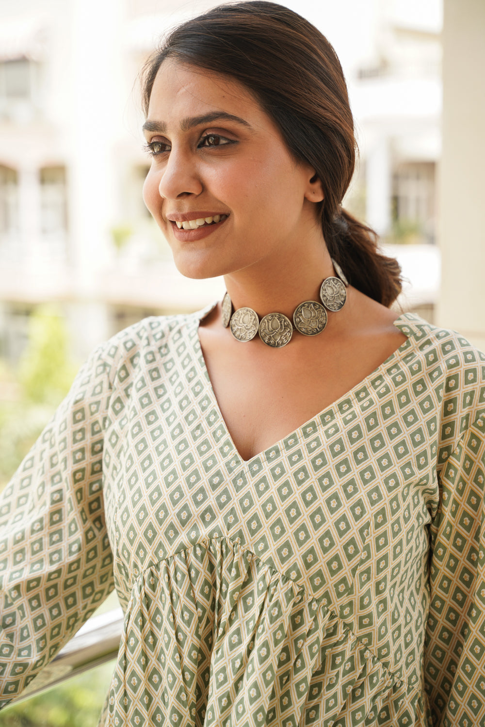 This is a perfect summer dress. Crafted in 100% cotton fabric, it's a green tier dress which has V-neck and three - quarter sleeves. The product material is also sure to keep you comfortable throughout the day. Pair it up with nude stilettos, good hairstyle and a cute handbag for a glamorous look.