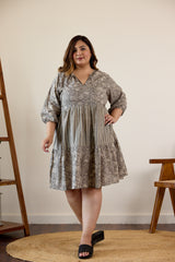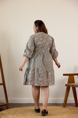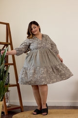 Introducing our Grey Bagru Print Tiered Dress. Featuring a captivating white floral print against a soft grey backdrop. The lace V-neckline adds a touch of refinement, along with dori detailing. Designed with tiered layers for graceful movement. Experience the fusion of cultural heritage and contemporary fashion in this versatile piece.
