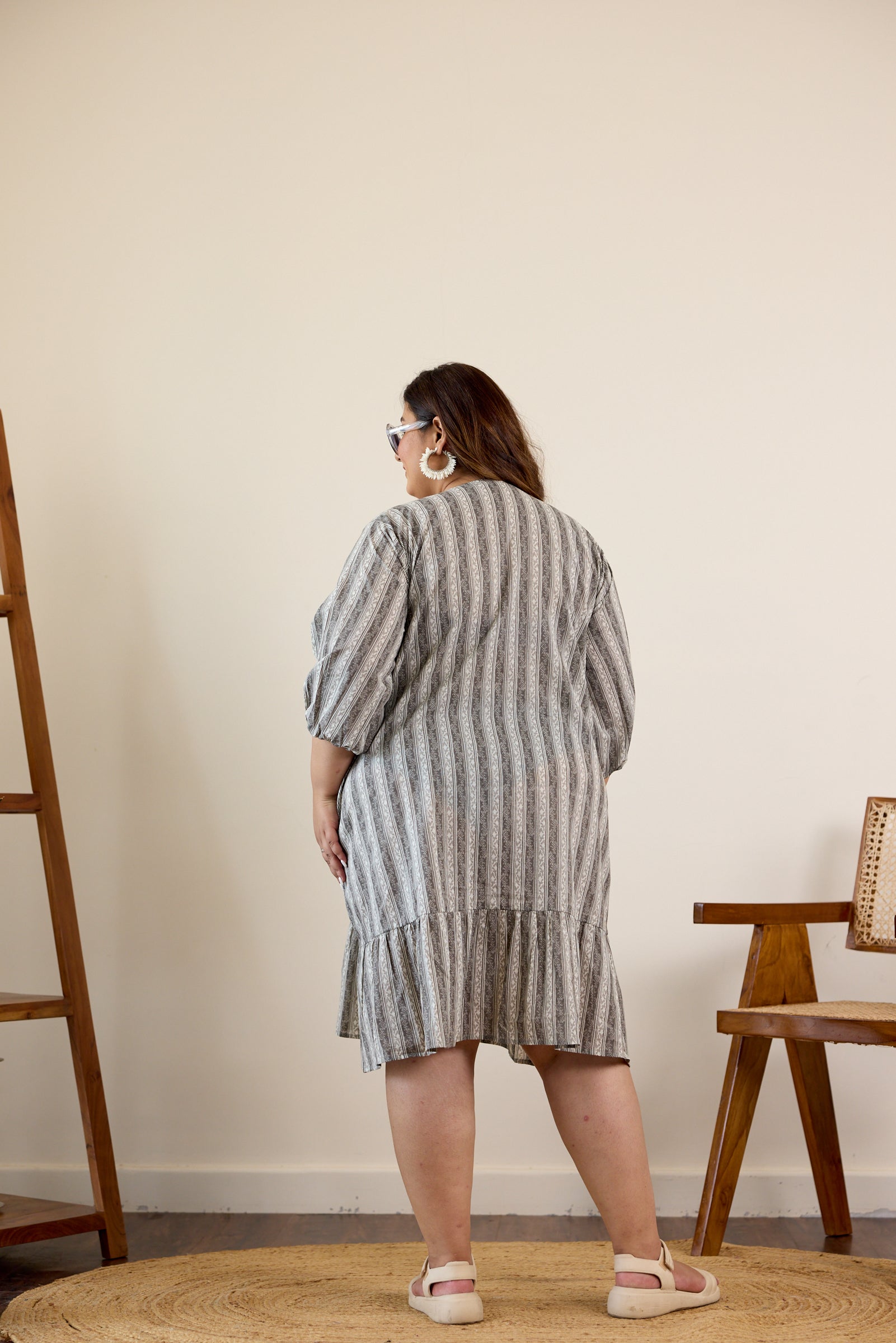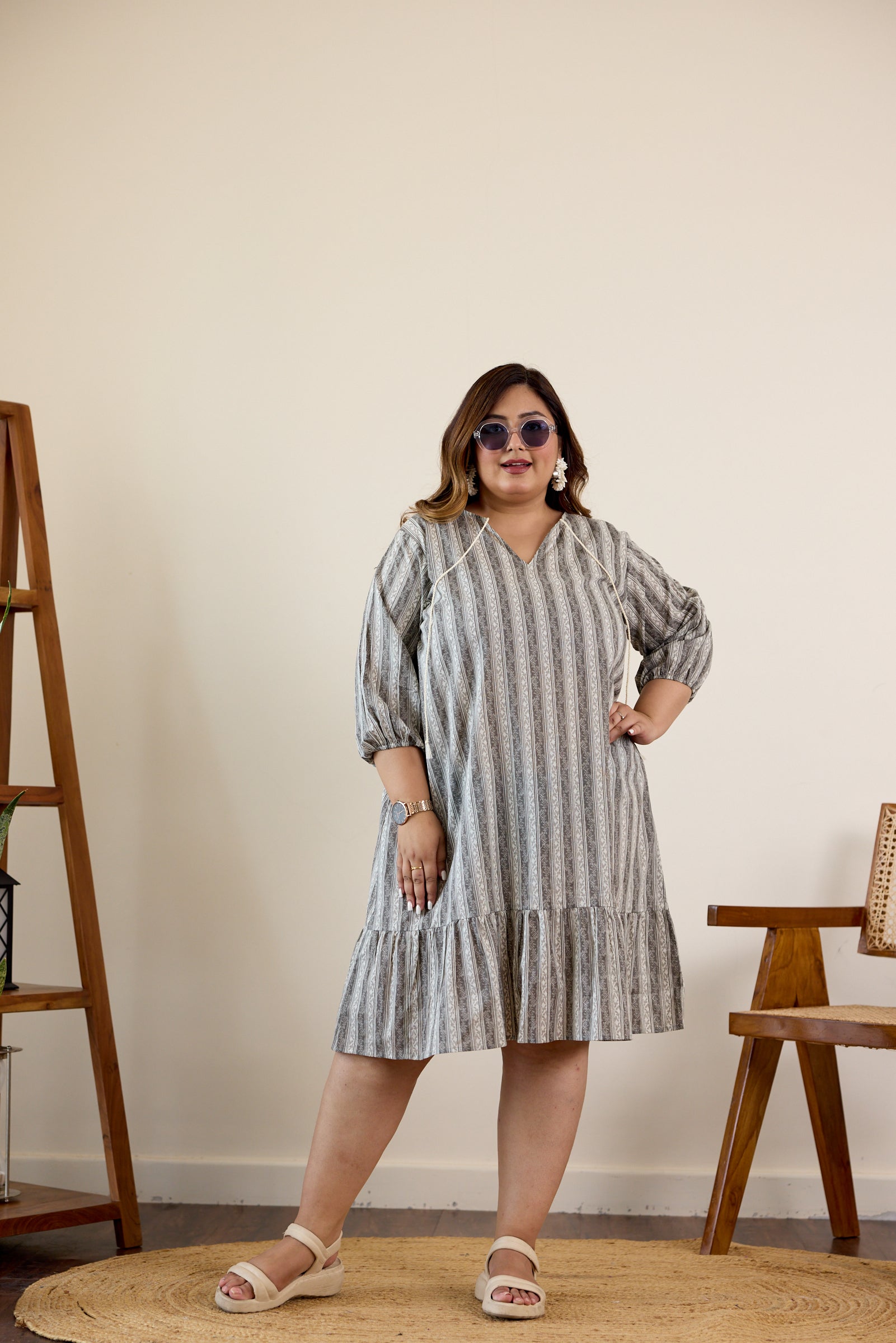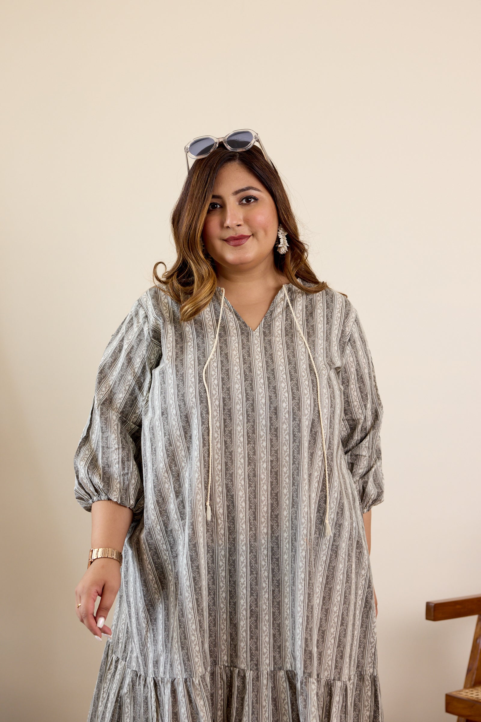 Introducing our Grey Striped Tiered Midi Dress, designed with serene white striped print. Crafted from 100% cotton, this dress offers a flattering v-neck and elasticated puff sleeves, ensuring both style and comfort. Perfect for any occasion, this versatile piece is a chic addition to your wardrobe..