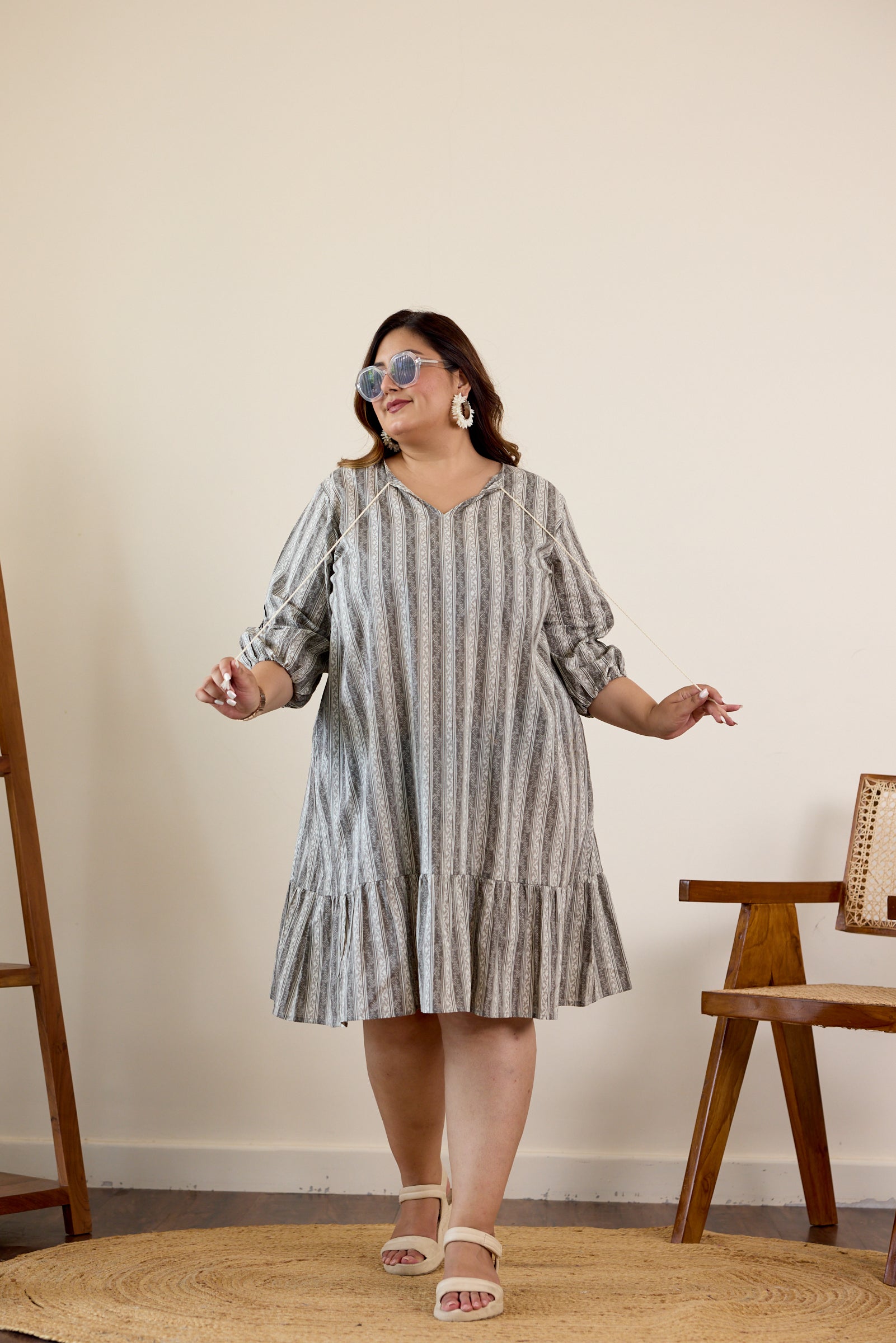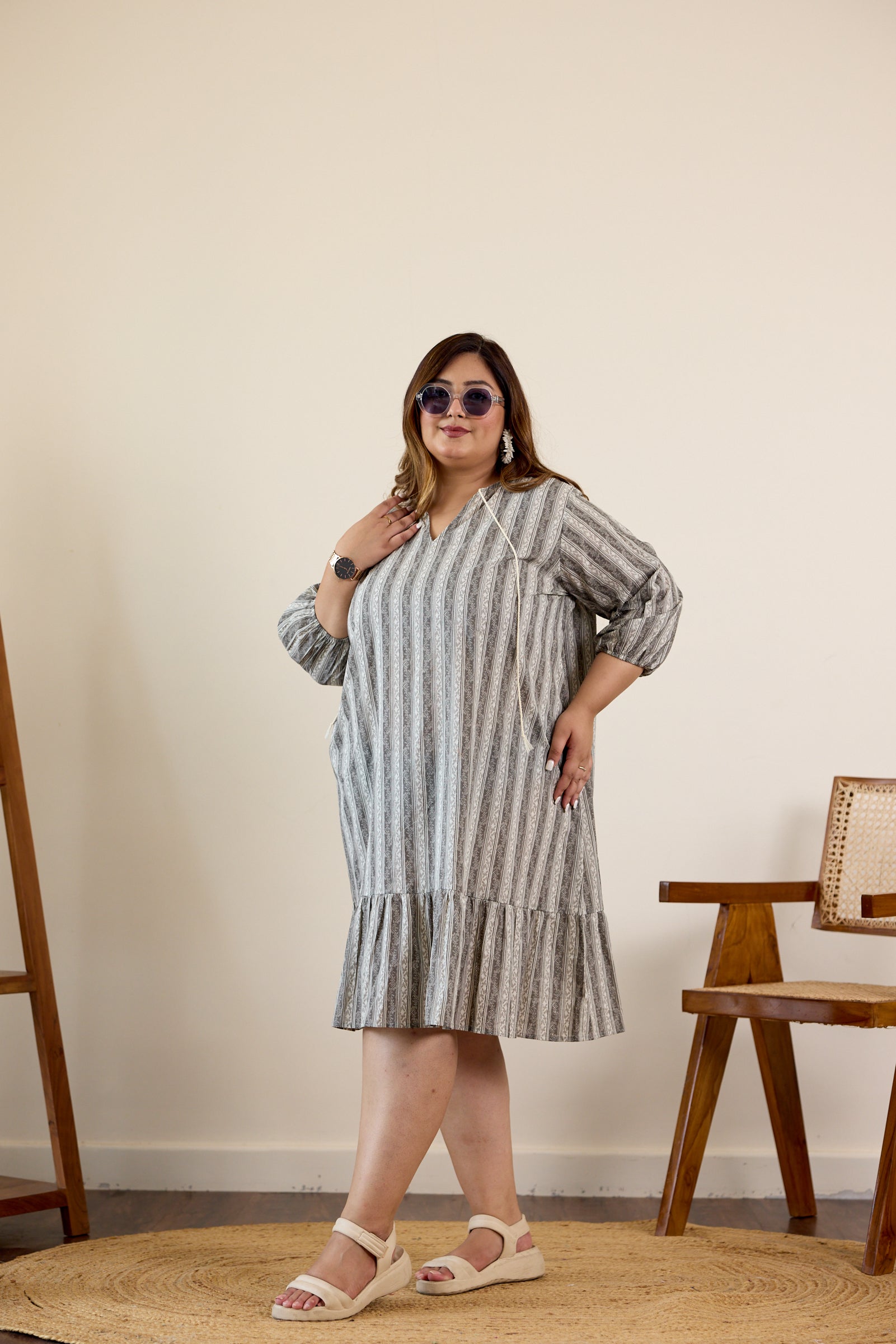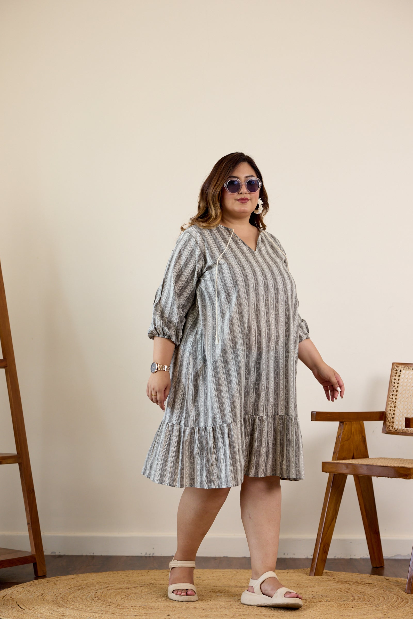 Introducing our Grey Striped Tiered Midi Dress, designed with serene white striped print. Crafted from 100% cotton, this dress offers a flattering v-neck and elasticated puff sleeves, ensuring both style and comfort. Perfect for any occasion, this versatile piece is a chic addition to your wardrobe..