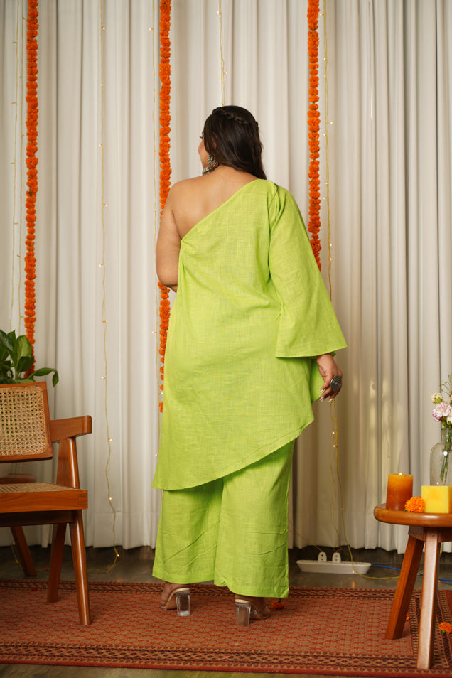 | Go green with this Lime Co-ord Set!! This fresh lime color has a very indo western feel. Wear it to your night parties or to a mehendi function with a choker and jhumkas. |