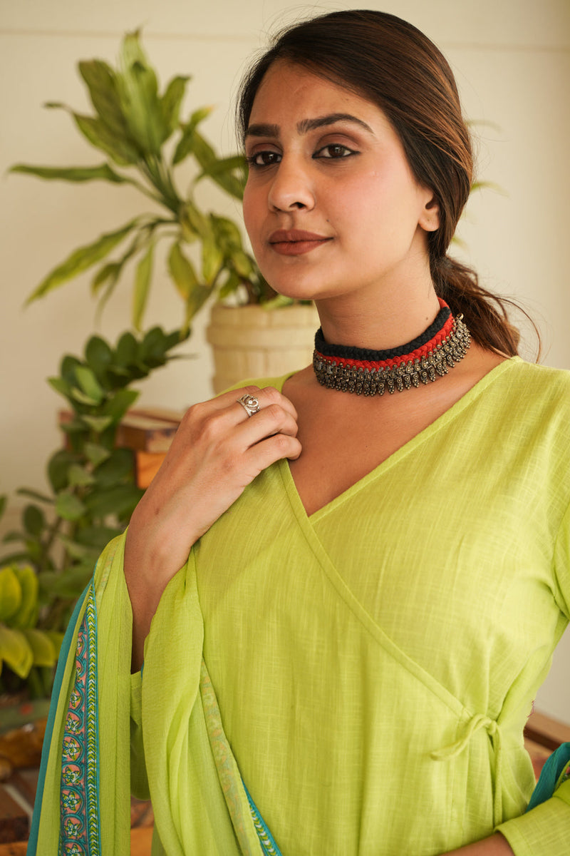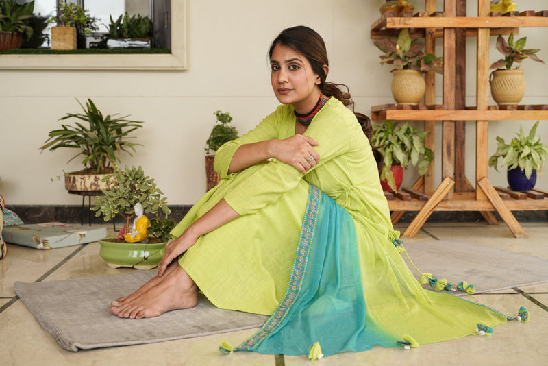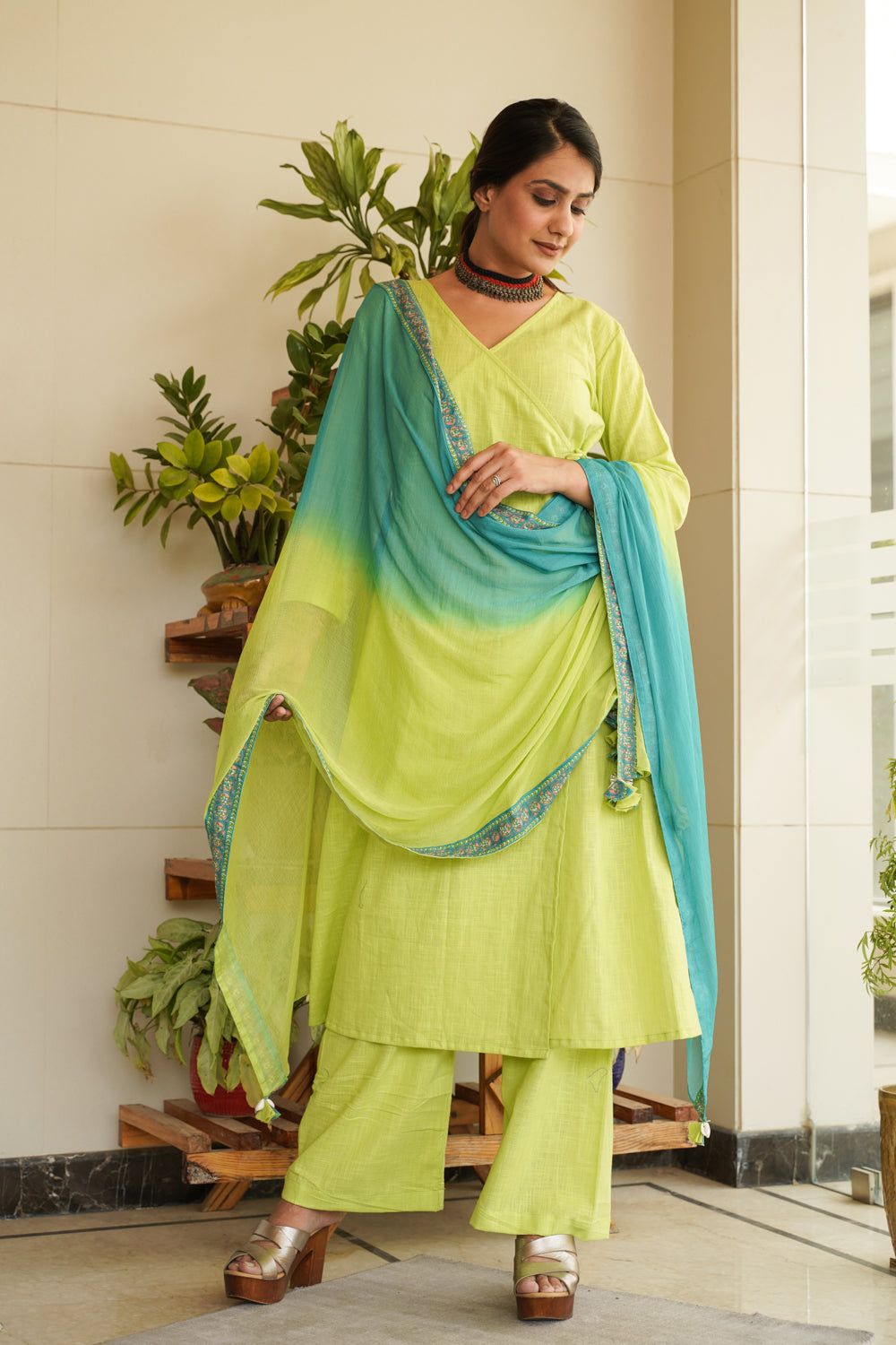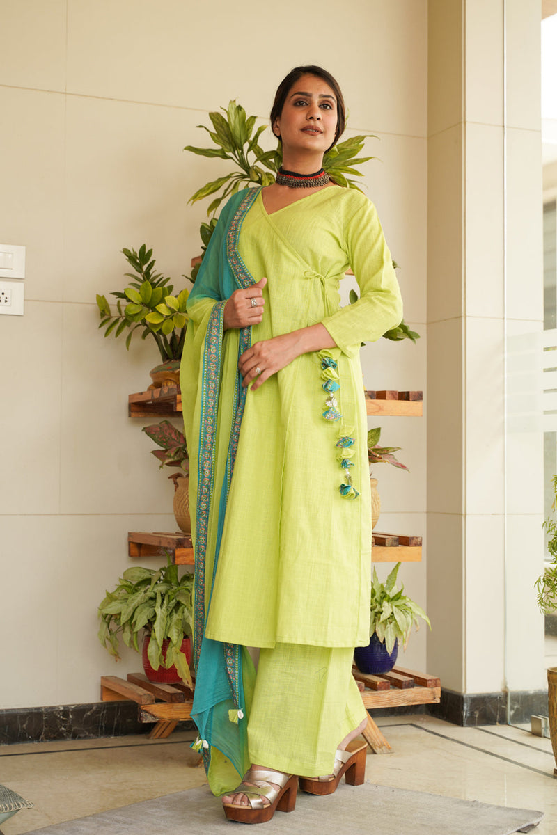 Add the right amount of elegance to your personality by choosing our lime green three-piece kurta set. Crafted in cotton slub fabric, it's a solid angrakha kurta which has V-neck, three-quarter sleeves and a tie up with cute tassels, comes along with a matching solid cotton flex pants and chiffon double shaded dupatta in lime green & blue color which has floral fabric border detailing and beautiful tassels on it. Club it with minimal ethnic jewellery and of course, don't forget to wear your pretty smile!