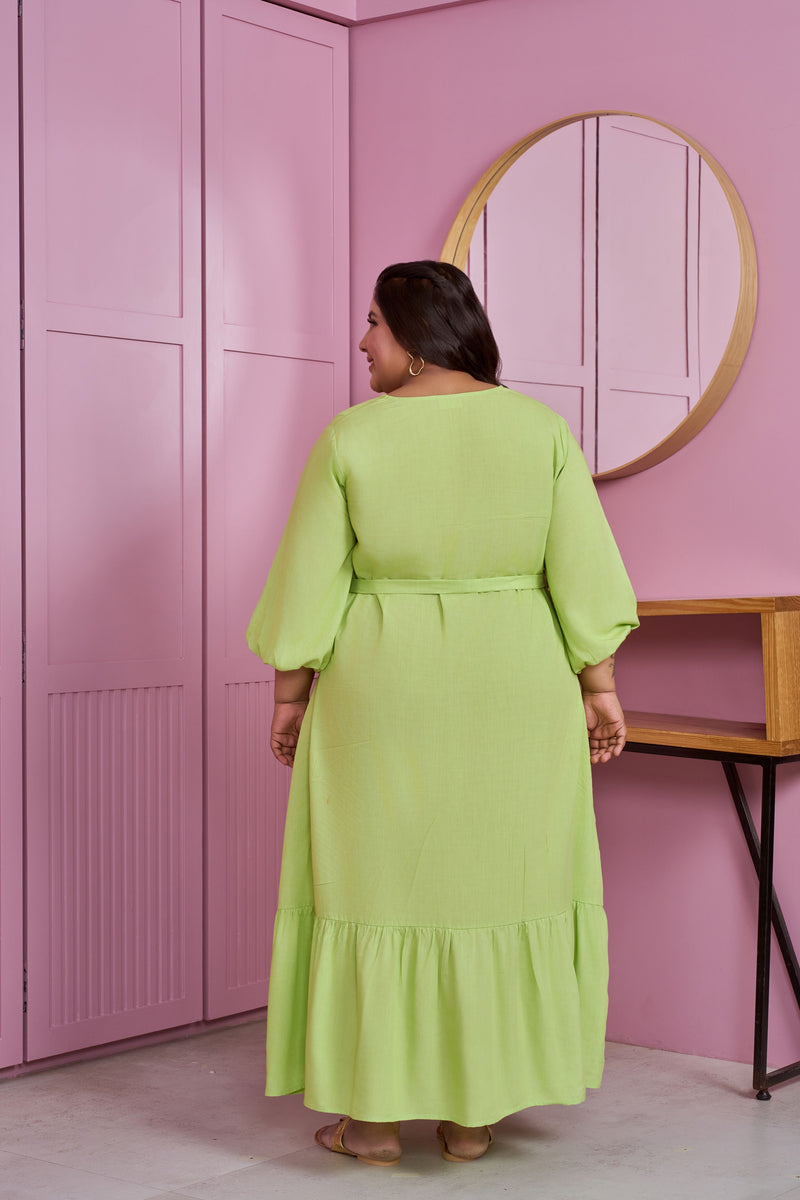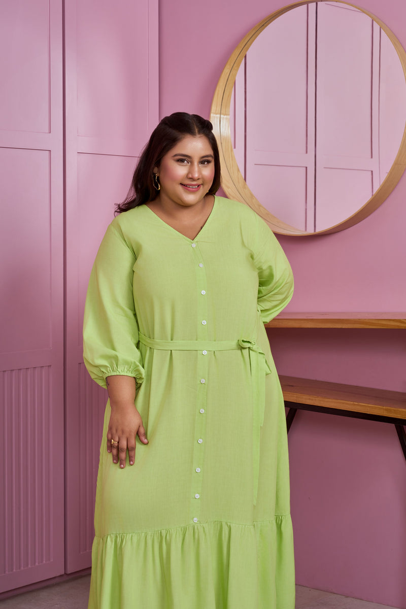 Dreamy dress alert! Step into effortless grace with our Lime Green Tiered Maxi Dress, crafted from soft modal fabric for unmatched comfort and style. This versatile dress features a flowy tiered design that flatters every curve, complemented by white decorative buttons. The smart gathered sleeves add a refined yet playful vibe to the look. The detachable belt sash cinches the waist perfectly, allowing you to tailor the fit to your preference. Ideal for brunch dates or casual outings, this dress blends chic simplicity with timeless elegance.