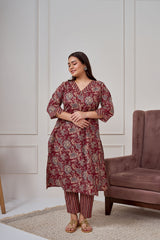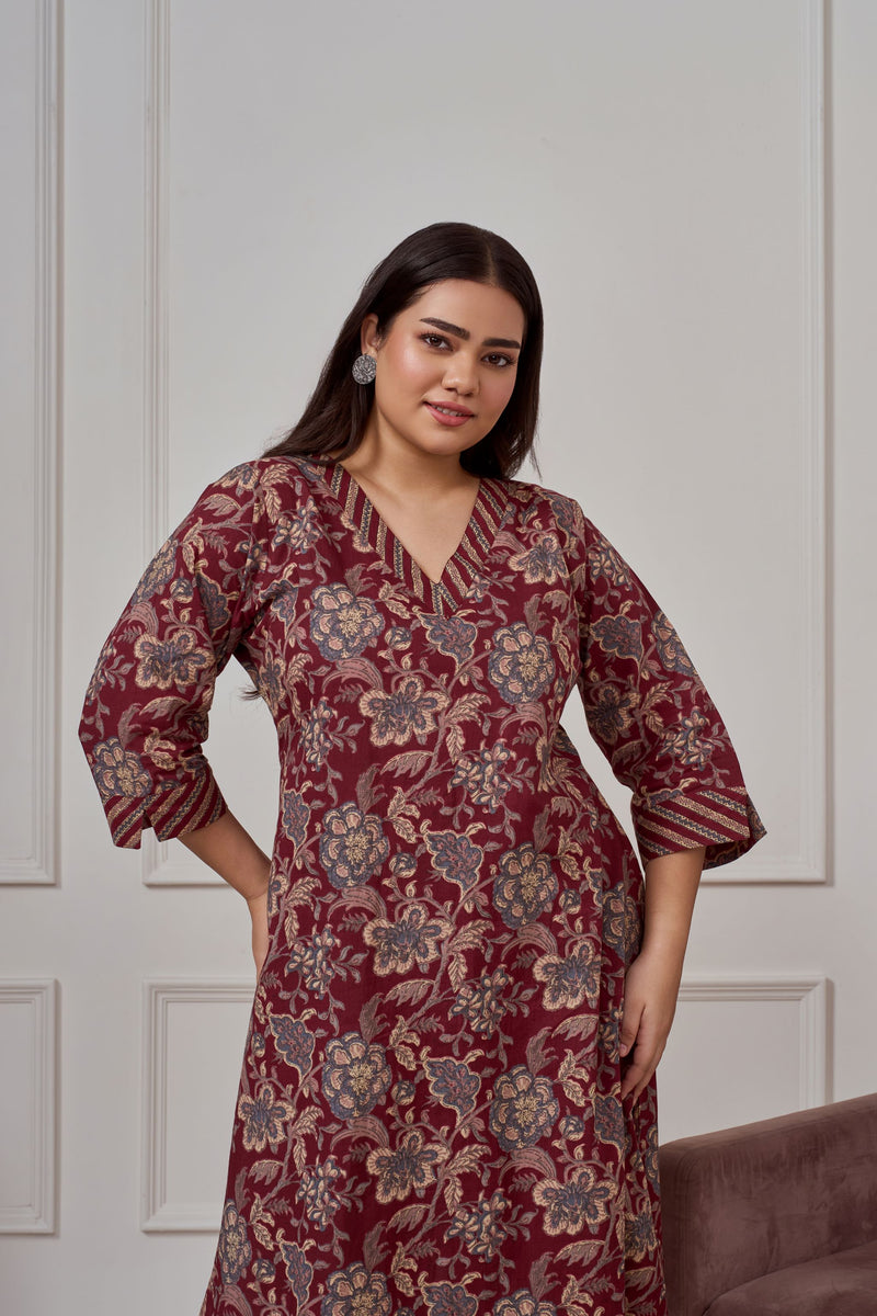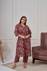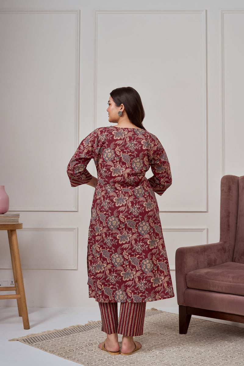 Introducing our Maroon Bagru Print Cotton Kurta Sett, a perfect blend of comfort and elegance. Crafted from 100% cotton fabric, this outfit features a floral print classic straight cut kurta with smart cuffs on sleeves with slit. It comes with straight pants with printed stripes. The classic straight cut adds a sophisticated touch, while practical pockets enhance utility. Perfect for office wear on festive occasions.