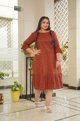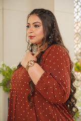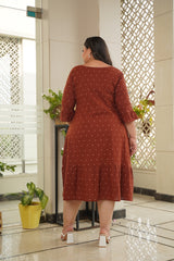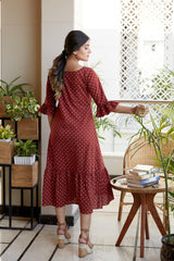 It's a maroon hand block printed polka dot one-tier maxi dress that has a round neck and ruffle bell sleeves. It's a mid-calf length maxi dress made in 100% cotton.