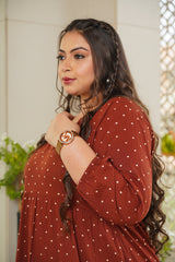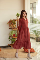 | This is a brownish maroon polka dot in cotton printed with hand block prints. This is split neckline with one tier with gathered sleeves. The dress is ankle length for a maxi look |