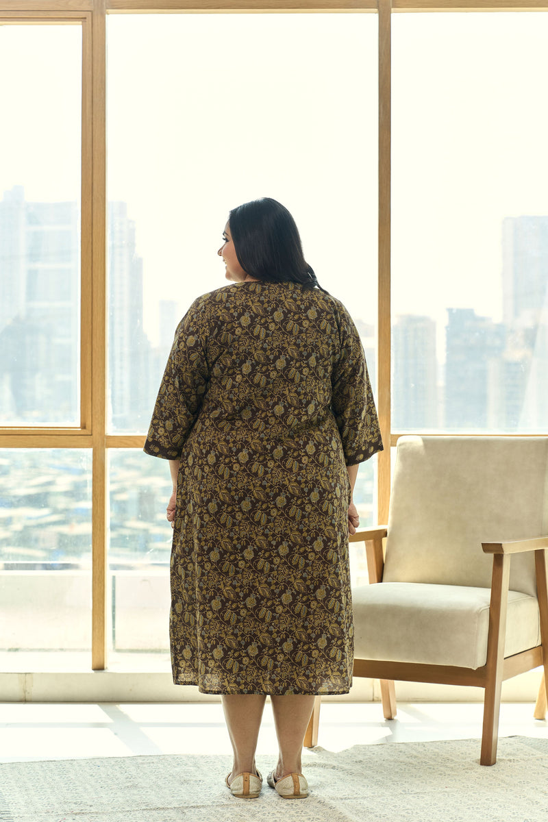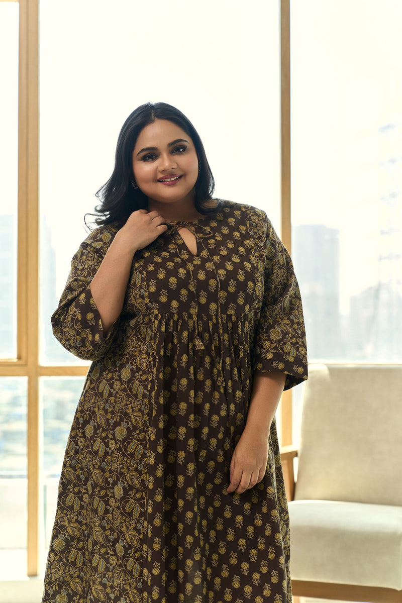 Make a statement with this elegant Mehendi green Ajrakh print midi dress, a perfect blend of traditional charm and contemporary style. Crafted from 100% cotton for breathability and comfort, this Indo-western dress features a pleated silhouette, three-fourth sleeves, and a front dori tie-up for added detail. The rich earthy tones and flowing design create a graceful, effortless look, making it ideal for festive gatherings, casual outings, or workwear.