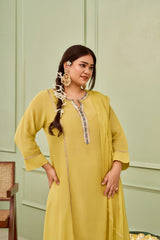 Step up your festive style with our Mehendi Green Muslin 3 Kali Suit Set.Crafted from 100% cotton fabric, this suit set features intricate gota lace work and a beautiful grey detailing on the placket.The relaxed pants ensure ease of movement, making it ideal for long festive days. Paired with a beautifully embellished matching chiffon dupatta, featuring a contrasting heavy border work and shimmering gota lines running along the width, bringing together style and grace for any occasion. Perfect for a festive gathering, offering the right balance of sophistication and comfort.