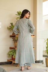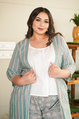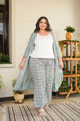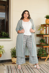 Look feminine and classy in our 3 piece co-ord set. Crafted with 100% cotton fabric in mint green color, it's a co-ord set which has a white solid top, a striped printed full sleeves long front open shrug and a floral print palazzo pants, making it a perfect sun-downer look. The shrug has a contrast floral print fabric detailing on the sleeves.