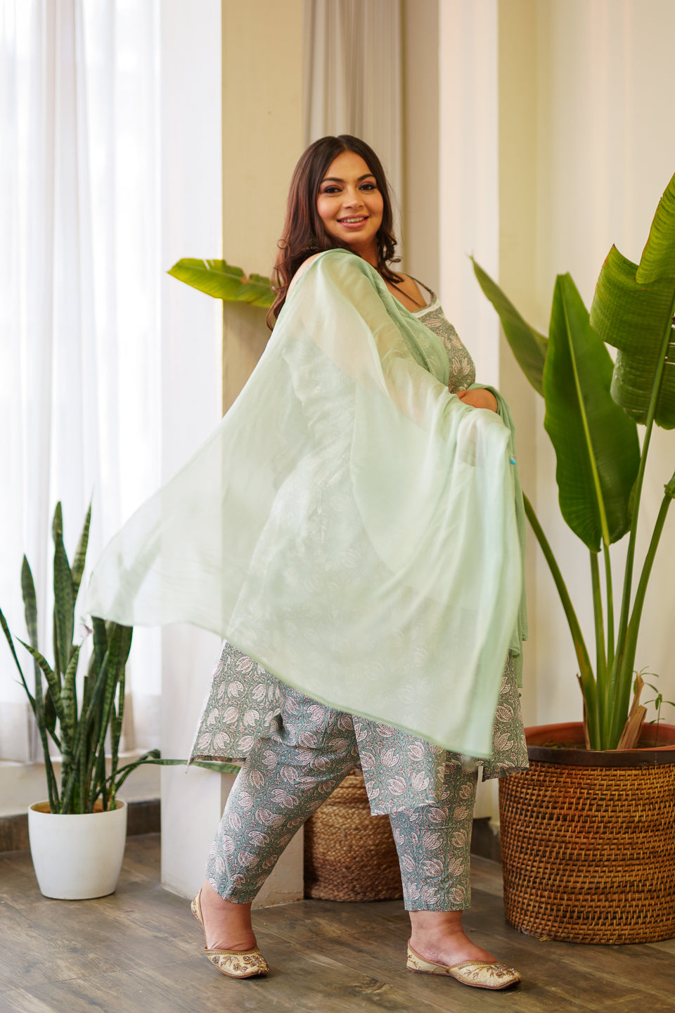 Mint Green Floral Strap Cotton Kurta Suit Set - (Set of 3)