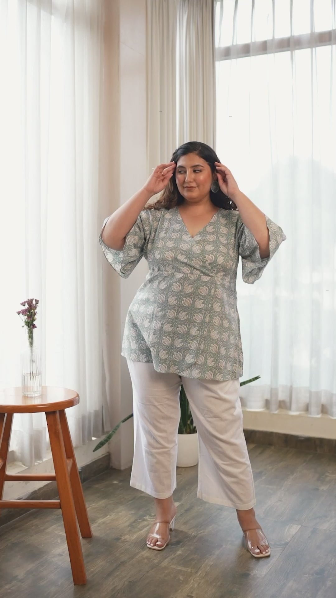 | - Crafted from lightweight cotton fabric, it's bell sleeves and lotus print on mint green color makes it an elegant and dreamy top. It's an angrakha style top forming V neckline. - Styling Tip : With it's comfortable fabric and loose fit, you can easily pair it up with a range of bottoms, pretty studs and a nice footwear to complete your look. |