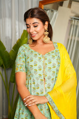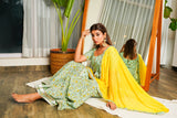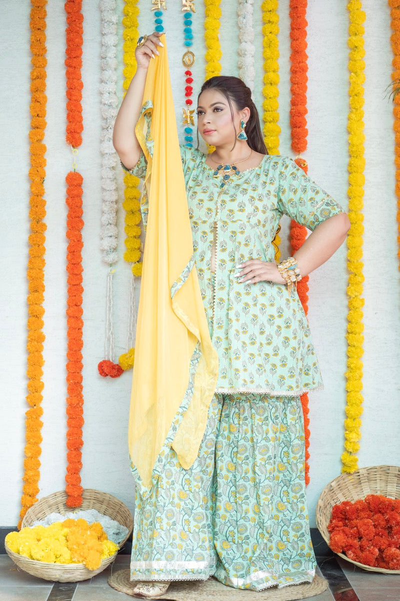 How about a Mint Sharara Set with center slit to throw on a mehendi day. This cotton sharara set with yellow dupatta would be a good head-turner. The kurta and sharara has beautiful gotta detailing with smart contrast lemon dupatta.
