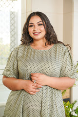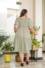 It's a black polka printed on moss green dress. The dress has a tiered look for good comfort and yet make it stylish. Also it is a hilo look dress. Such dresses can be worn with a day to night look depending on how you stylise it.