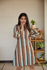 It's a basic multi striped hand block printed short dress with bishop sleeves and round neck. It's a full sleeves dress with ruffle detailing.