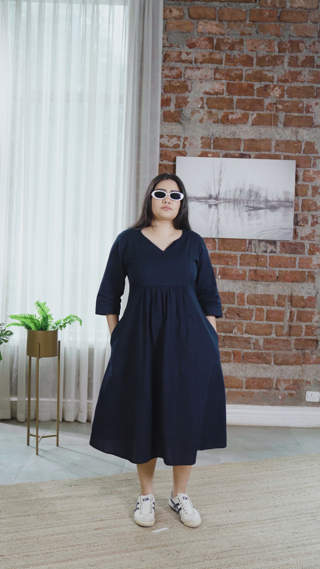 Navy Blue V-Neck Linen Midi Dress with Gathered Waist
