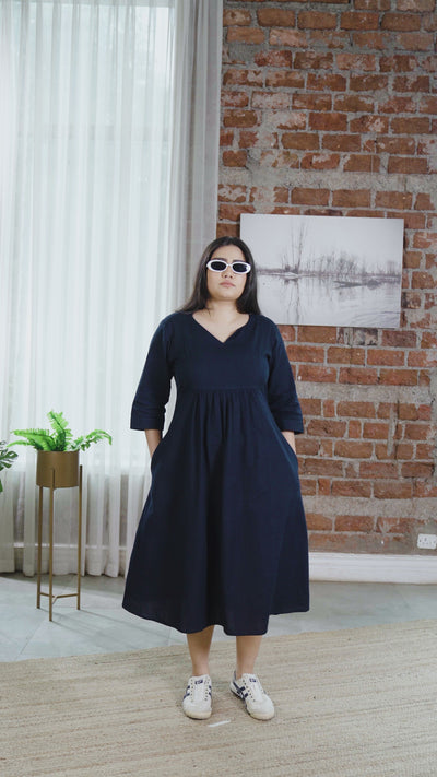 Navy Blue V-Neck Linen Midi Dress with Gathered Waist Sale price₹1,499 Regular price₹2,499
