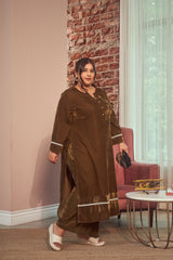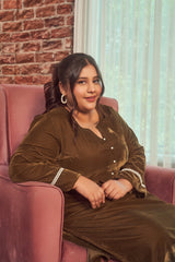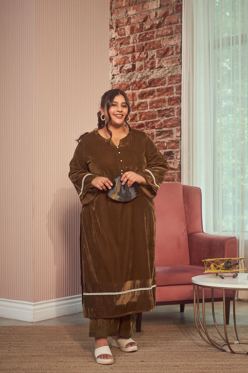 It's a 2 peice olive velvet kurta set. The kurta has chic pearl and lace detailing. The velvet fabric in olive color gives it a very royal look. be comfortable and wear it to house parties or dining with your beau.. |
