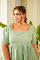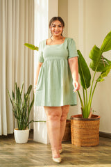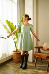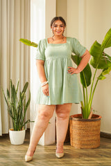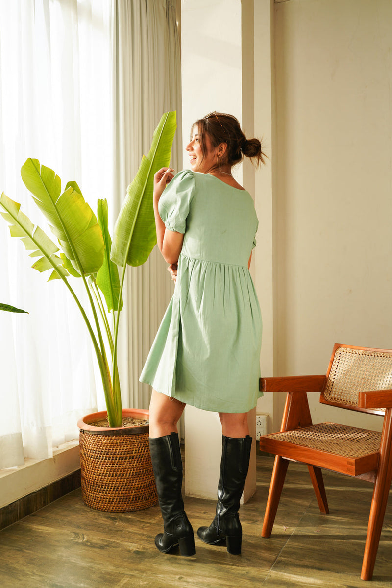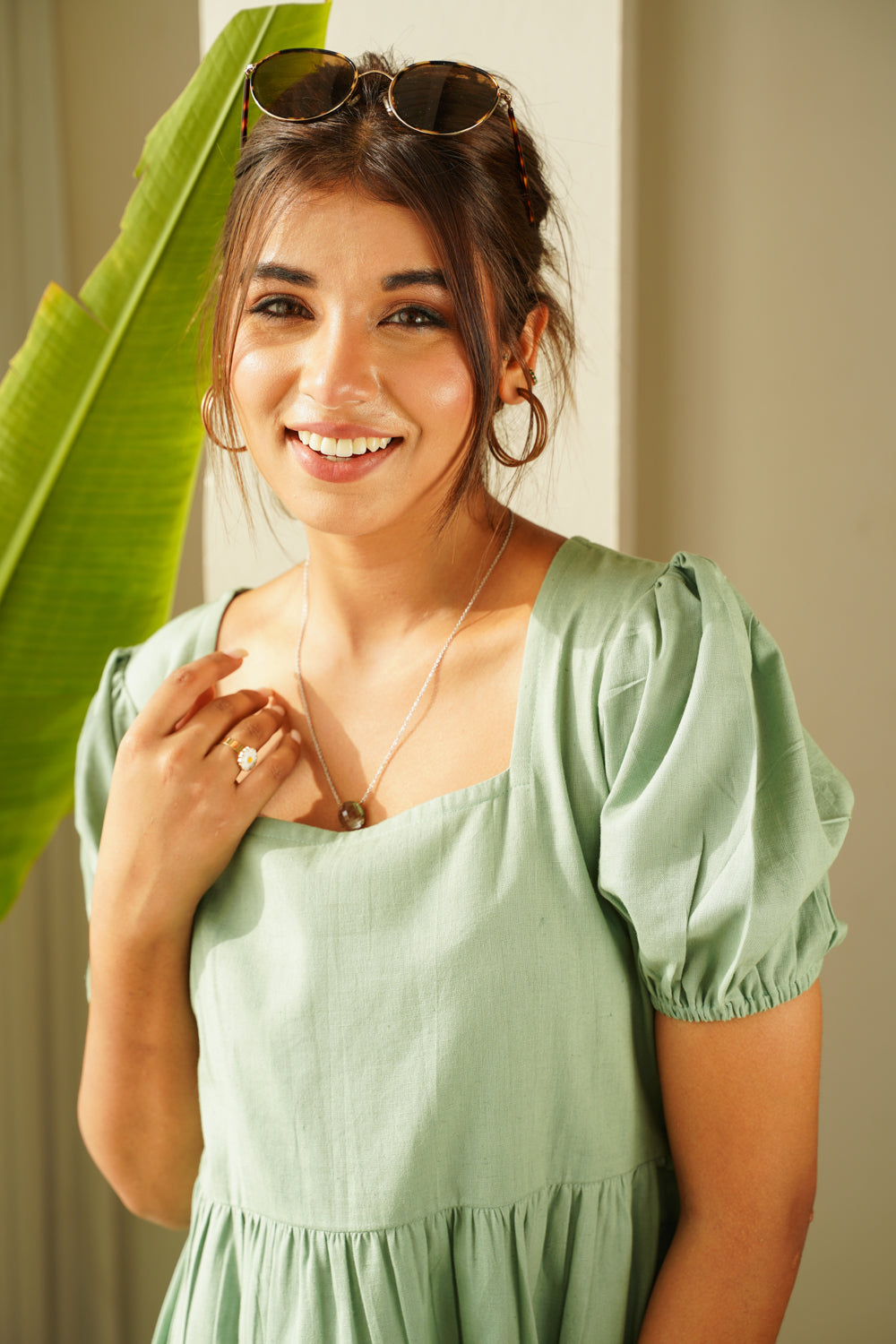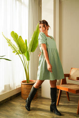 It's a sage green short dress with elasticated sleeves for that chic look. It's a solid dress and style it with a beaded clutch or a printed cape.