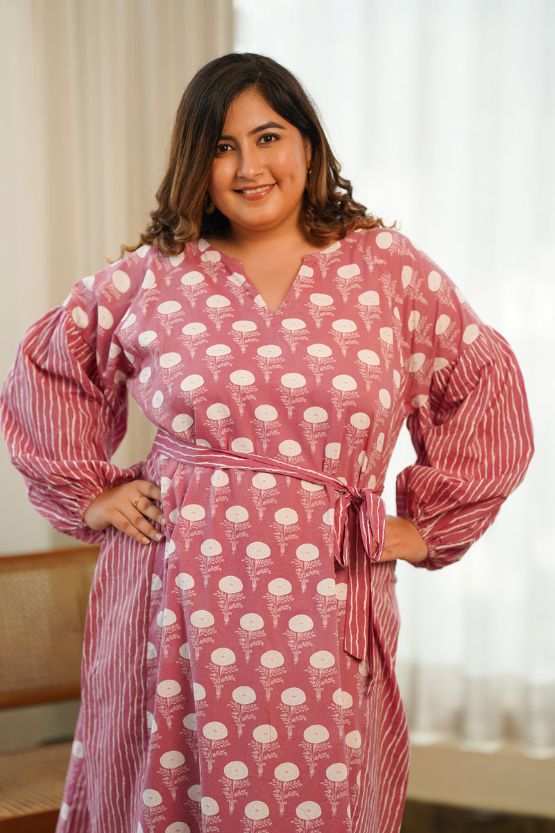 | It's a nice relaxed exaggerated sleeves dress. The boota print with play of stripes makes it really quirky. Cinch the waist with belt or keep it relaxed. |
