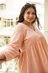 This is a perfect summer dress. Crafted in cotton flex fabric, this peach tier solid dress has V neck and three - quarter sleeves. Pair it up with nude stilettos and gold accessories for a glamorous look.