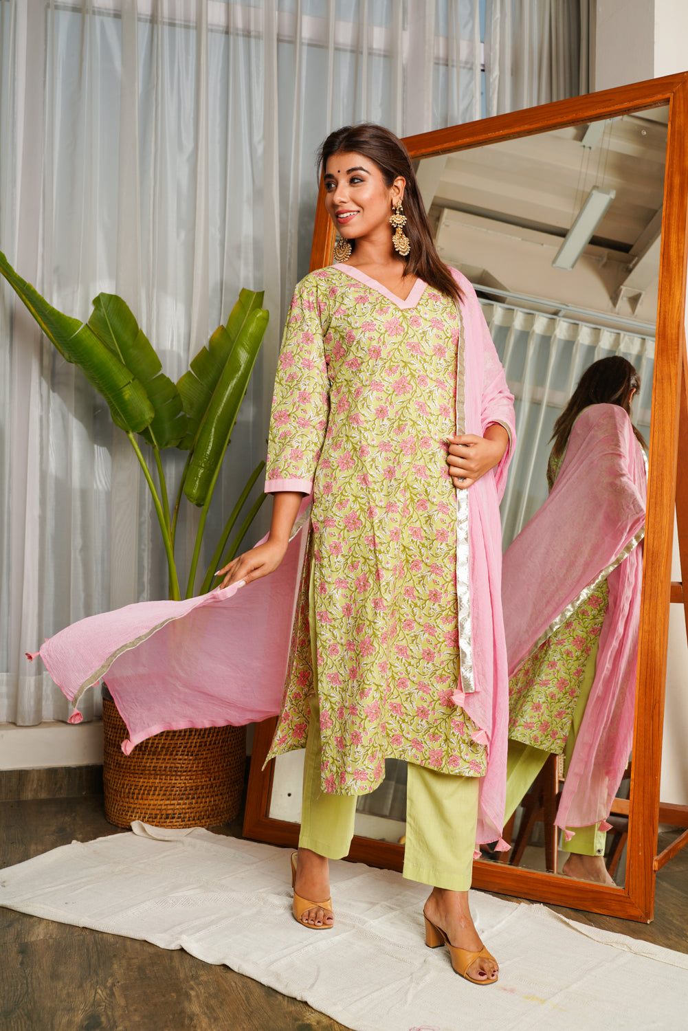Pear Green V-Neck Cotton Printed Suit Set - (Set of 3)