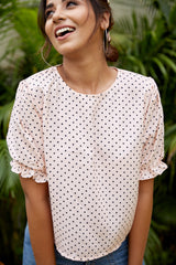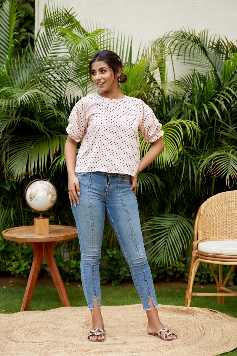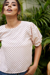 This is a really cute black polka on peach top with elasticated sleeves. This top has a relaxed fit and this formal look and can be worn to any party with smart denims or culottes. It's an easy to use fabric which does not crush much.