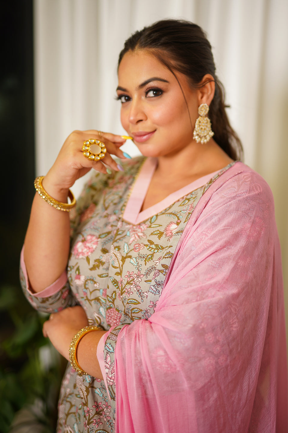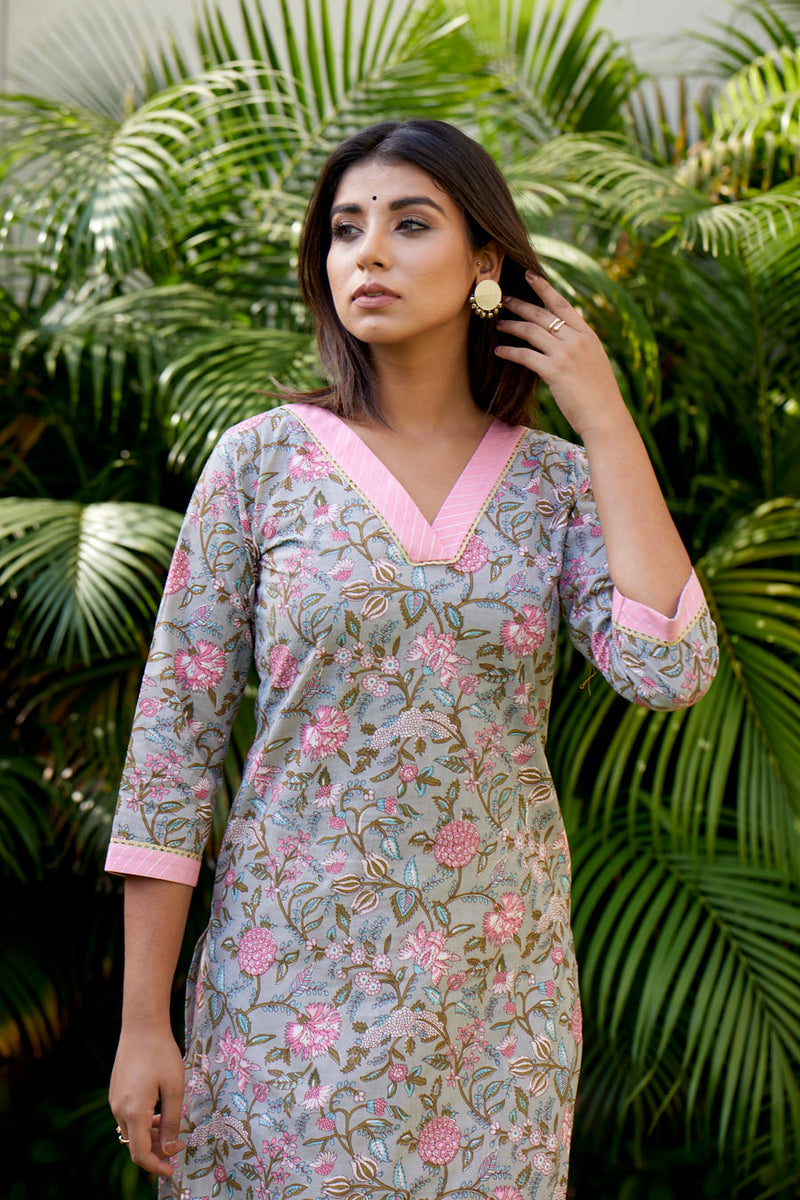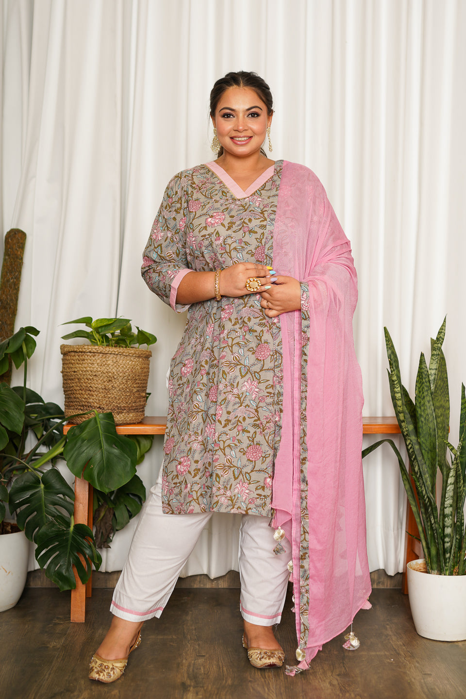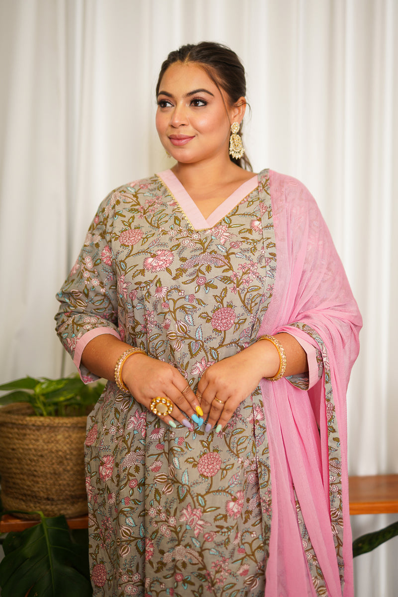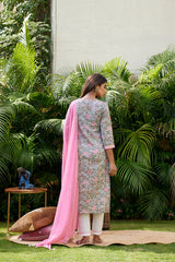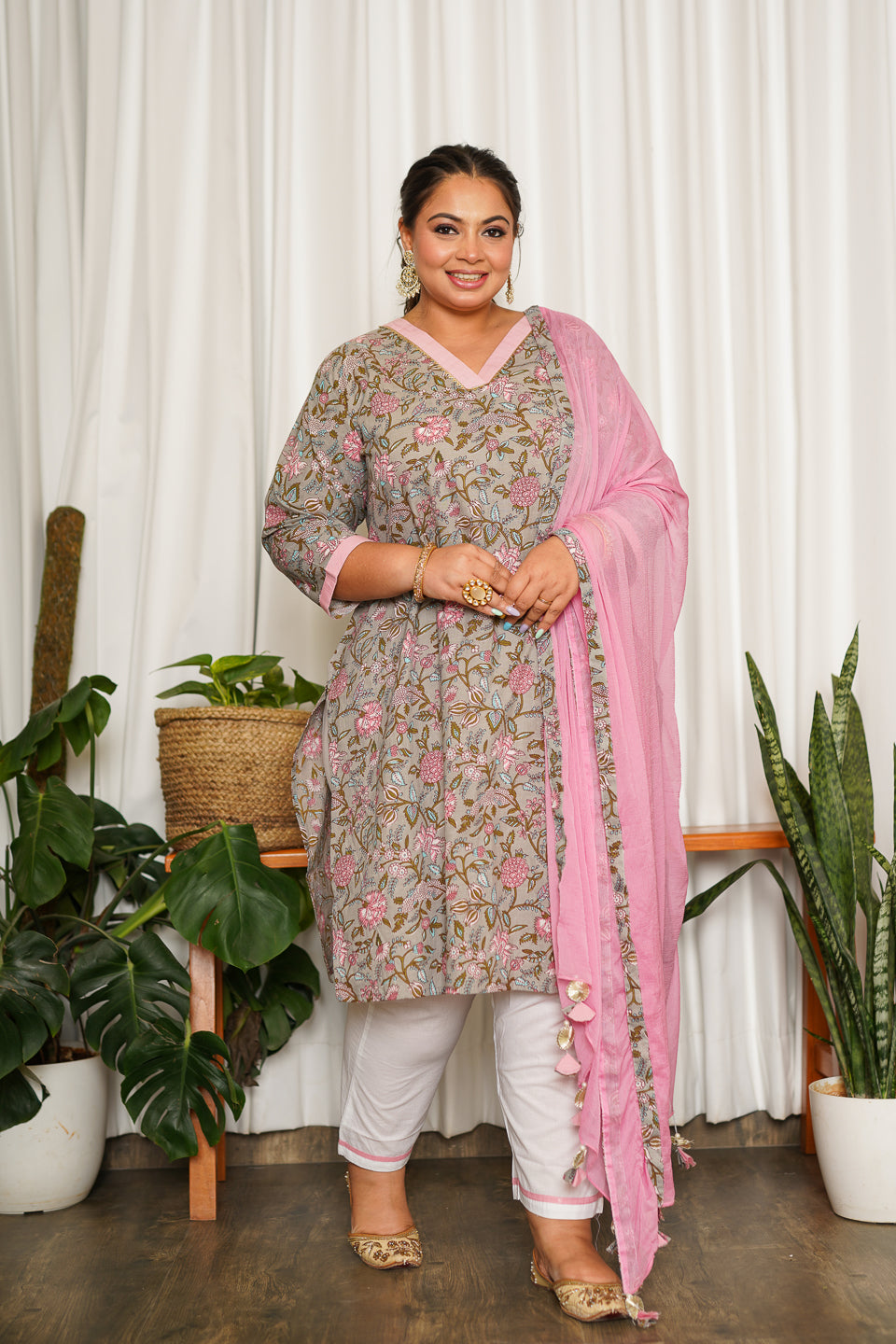 Pink Grey Floral V Neck Cotton Suit Set - (Set of 3)