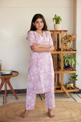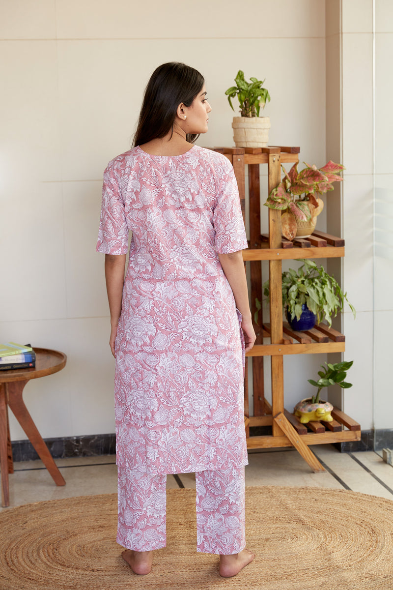 This is a 100% cotton hand block floral print long kurta with pyjama set in onion pink color. Both top and bottom are in same color and print for a co-ordinated look(co-ord set)