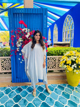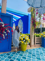| This is a georgette cape dress in pastel blue shade with sleeveless top and linen pants. This three-piece set is in powder blue color and has gotta embroidery on the cape part. |