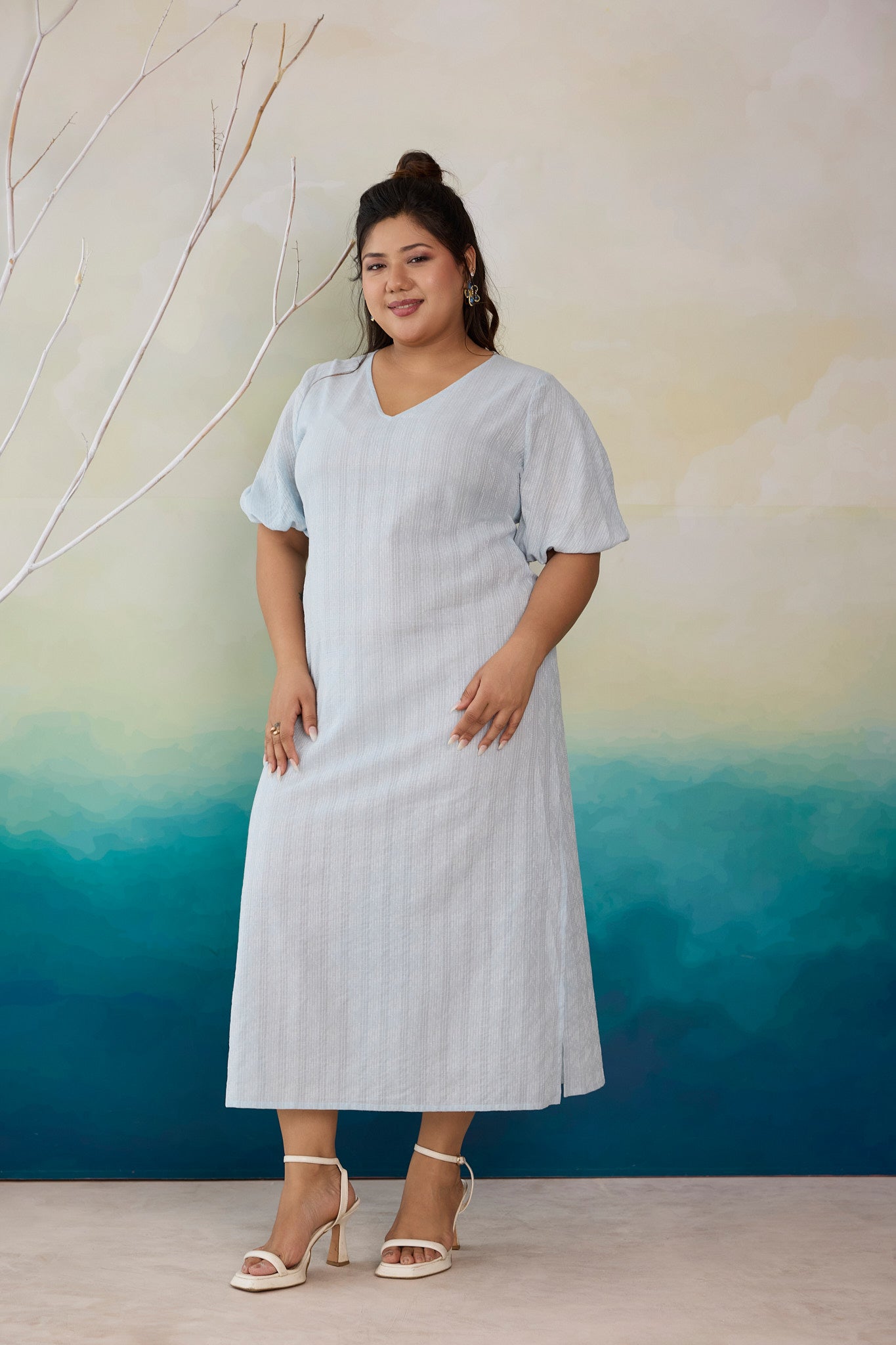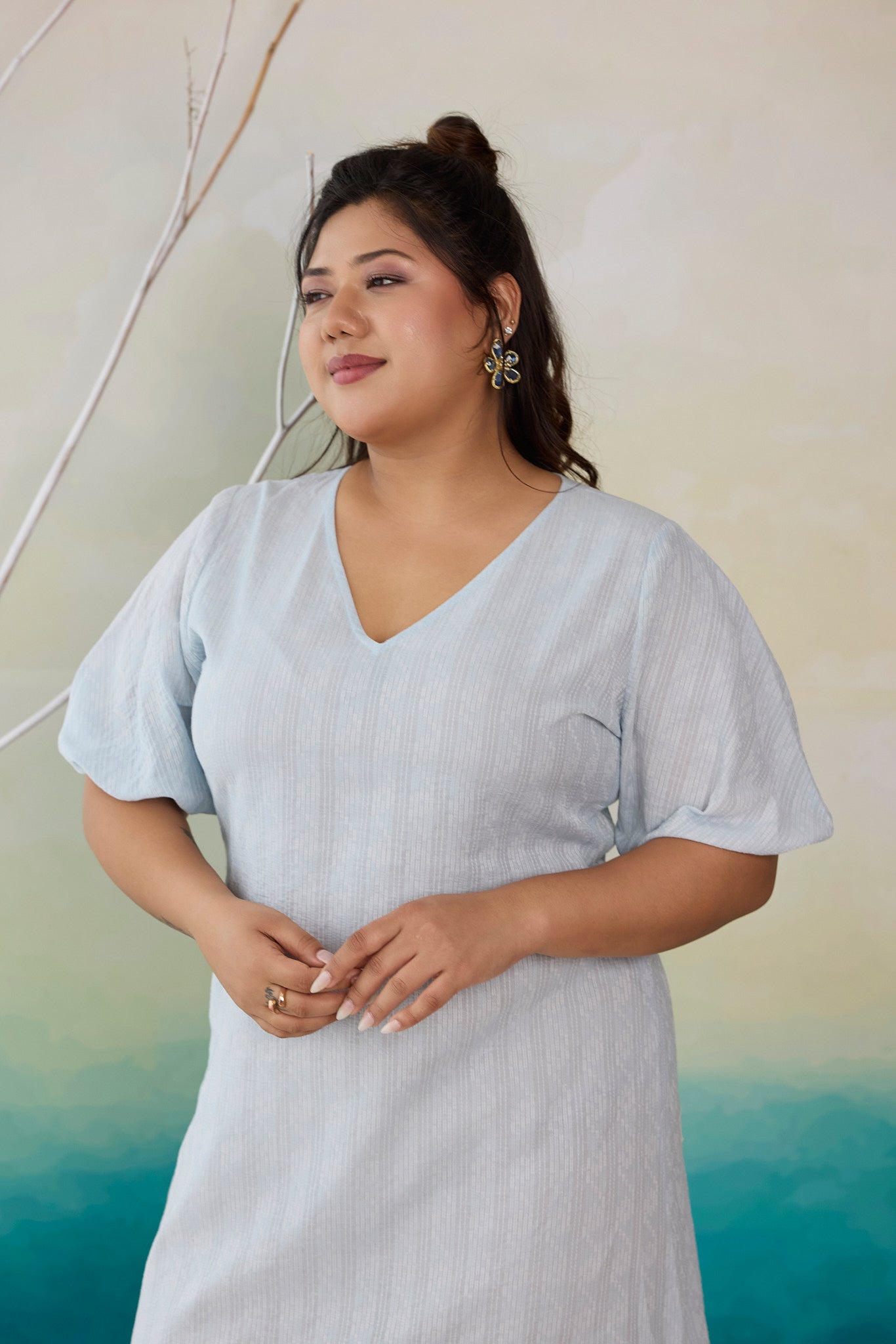 A breeze wrapped in stitches of tradition—this Powder Blue Kantha Cotton Maxi Dress is all things serene and soulful. Crafted from 100% cotton Kantha fabric, it radiates gentle charm with a touch of artisanal finesse. The dreamy powder blue hue soothes the eye, while subtle textured kantha lines whisper tales of handcrafted grace. Designed with a soft V-neckline and half puff sleeves, it floats into a relaxed silhouette that flares gently into a side-slit hem, adding just the right dash of drama. Light, breathable, and timeless, this is your go-to for slow days, long strolls, or a quiet evening under the sky.