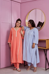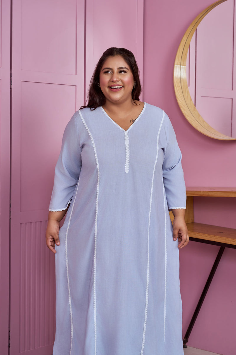 Introducing our Powder Blue Modal Kurta Set, a perfect blend of comfort and elegance. Crafted from soft modal fabric, this outfit features a stylish straight kurta with full sleeves and matching solid pants in a serene powder blue color. The delicate white crochet lace detailing adds a sophisticated touch, while practical pocket enhance utility. Perfect for office wear on festive occasions.