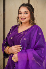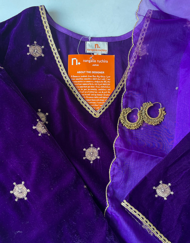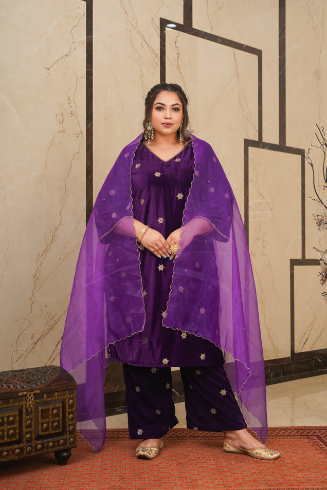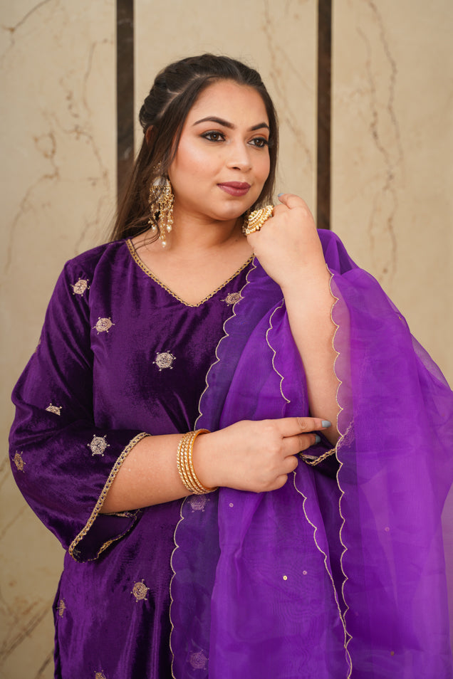 It's a Purple Kurta Three Peice Set. The kurta and pants are embroidered with smart sequins and zari with bell sleeves and same shade palazzo pants. The look is completed with same shade organza hand work dupatta. Such a Velvet Kurta set is apt for a mehendi day or a day wedding event. Such an elegant kurta set will make you look elegant and sophisticated in any event.