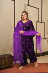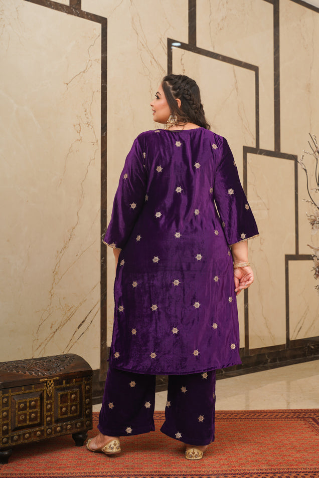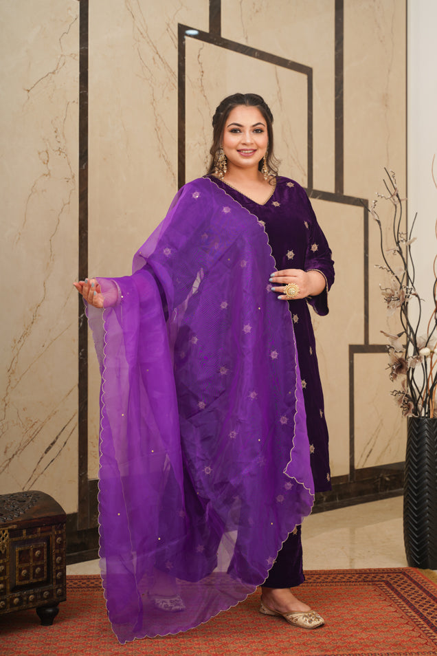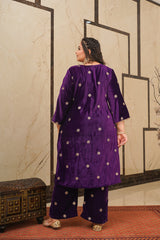 Purple Embroidered Velvet Kurta Set - (Set of 3)