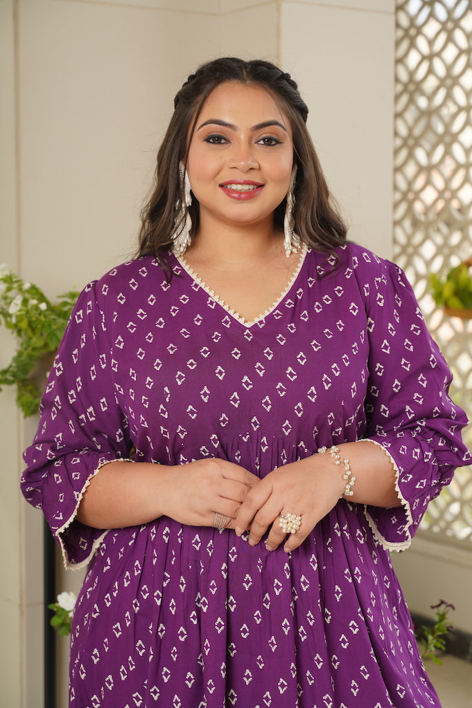 | It's a glam purple tiered dress with a good straight look fit. The dress is accentuated with gathered elasticated sleeves to give that chic look. If you are hosting a party, then flaunt this purple good-fit dress. |