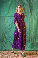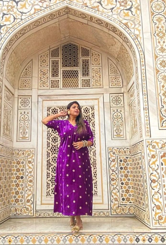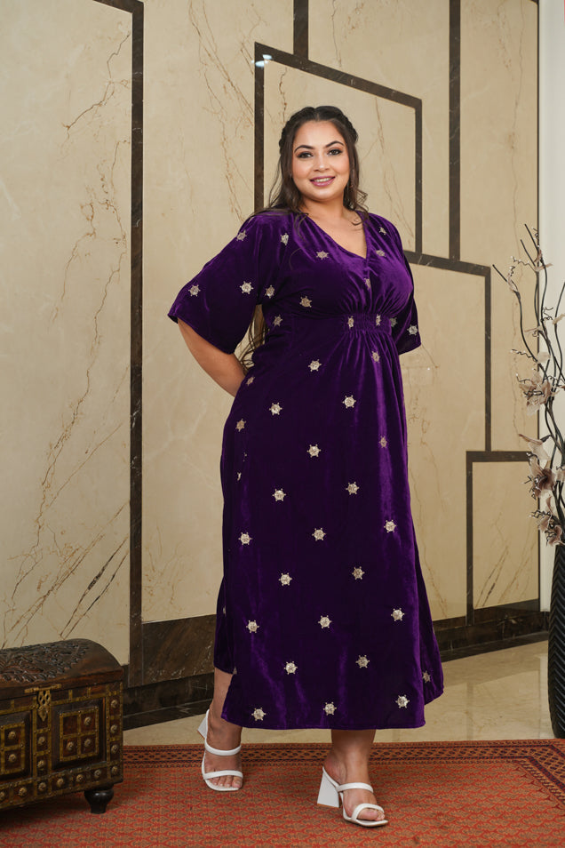 This a Sassy Rich Velvet gold embroidered kaftan style maxi with tucks for waist. It has side slit for the suave look. Dress it up or down. throw to a chic wedding with a choker or to a night party.