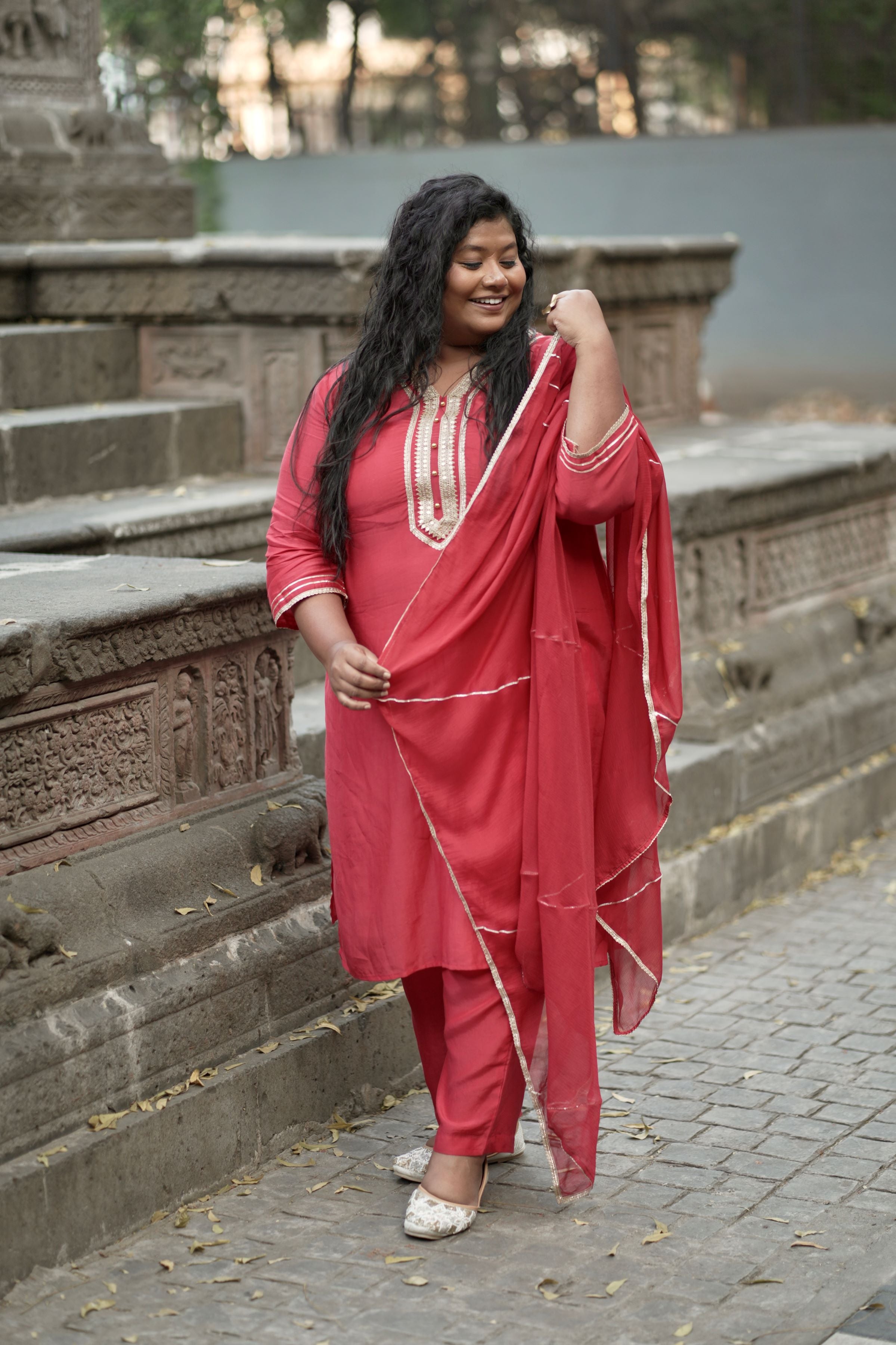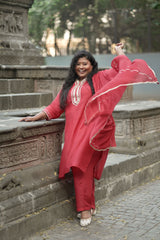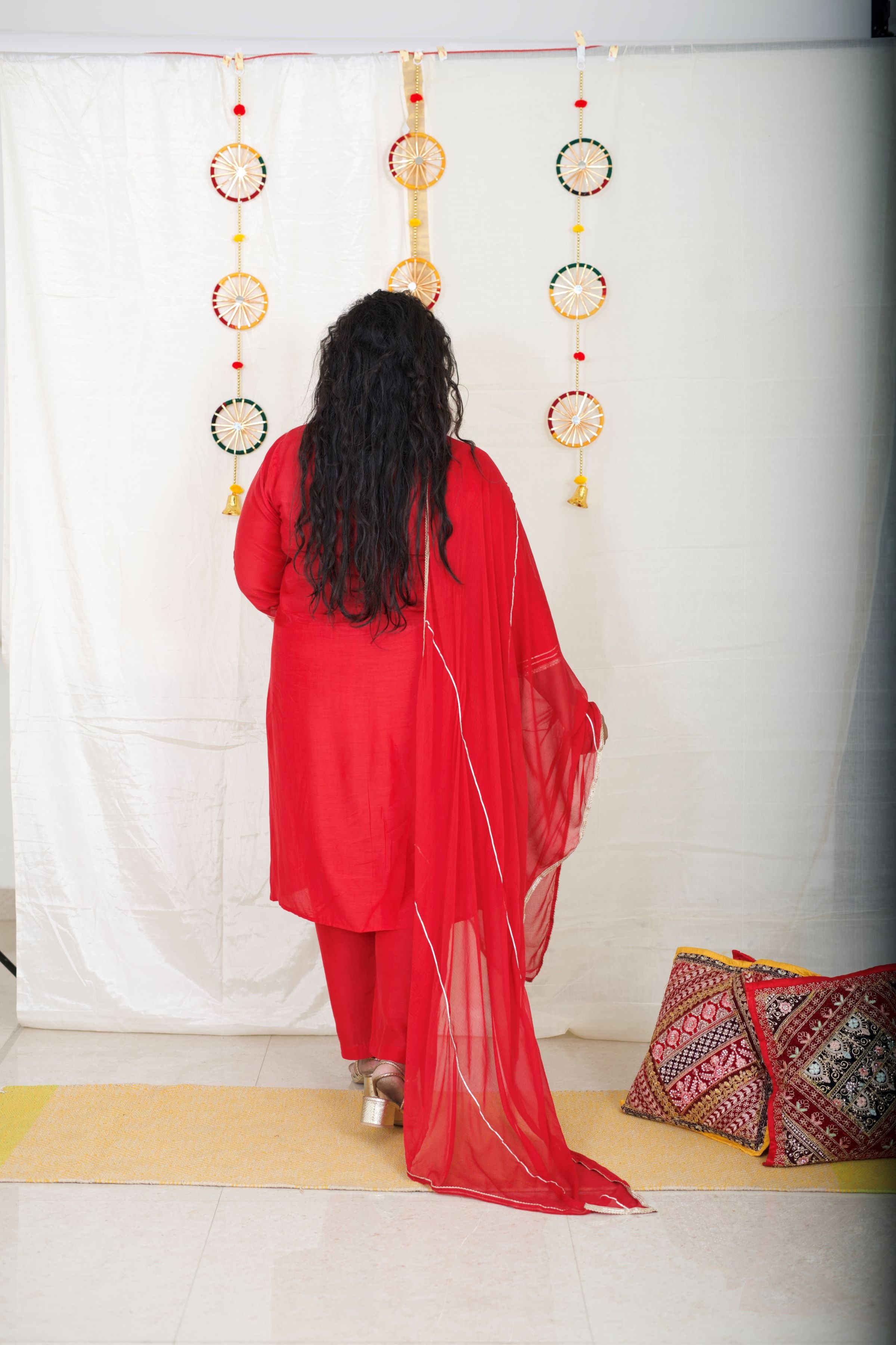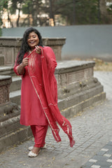 Our Red Cambric Suit Set features intricate gota lace detailing and golden buttons. Crafted from 100% cotton, it ensures a soft, breathable feel, perfect for all-day wear. The 3/4th sleeves feature an elegant golden border, while the relaxed solid pants. Completing the look is a flowing chiffon dupatta adorned with a shimmering gold magzi border and fine gota lines across the width, adding a touch of festive drama. This outfit effortlessly blends traditional elegance with modern sophistication, making it a standout choice for a special occasions.