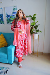 Red Floral Anarkali Suit Set - (Set of 3)