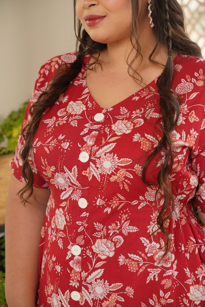 | It's a button down maxi shirt dress in classic red color. It has a V neck, side elastics on waist and statement white buttons. The big floral print on eye-pleasing cherry red background is the highlight of this one piece. Crafted in finest handblock printed cotton, this one piece will prove a smart choice for your casual wardrobe. |