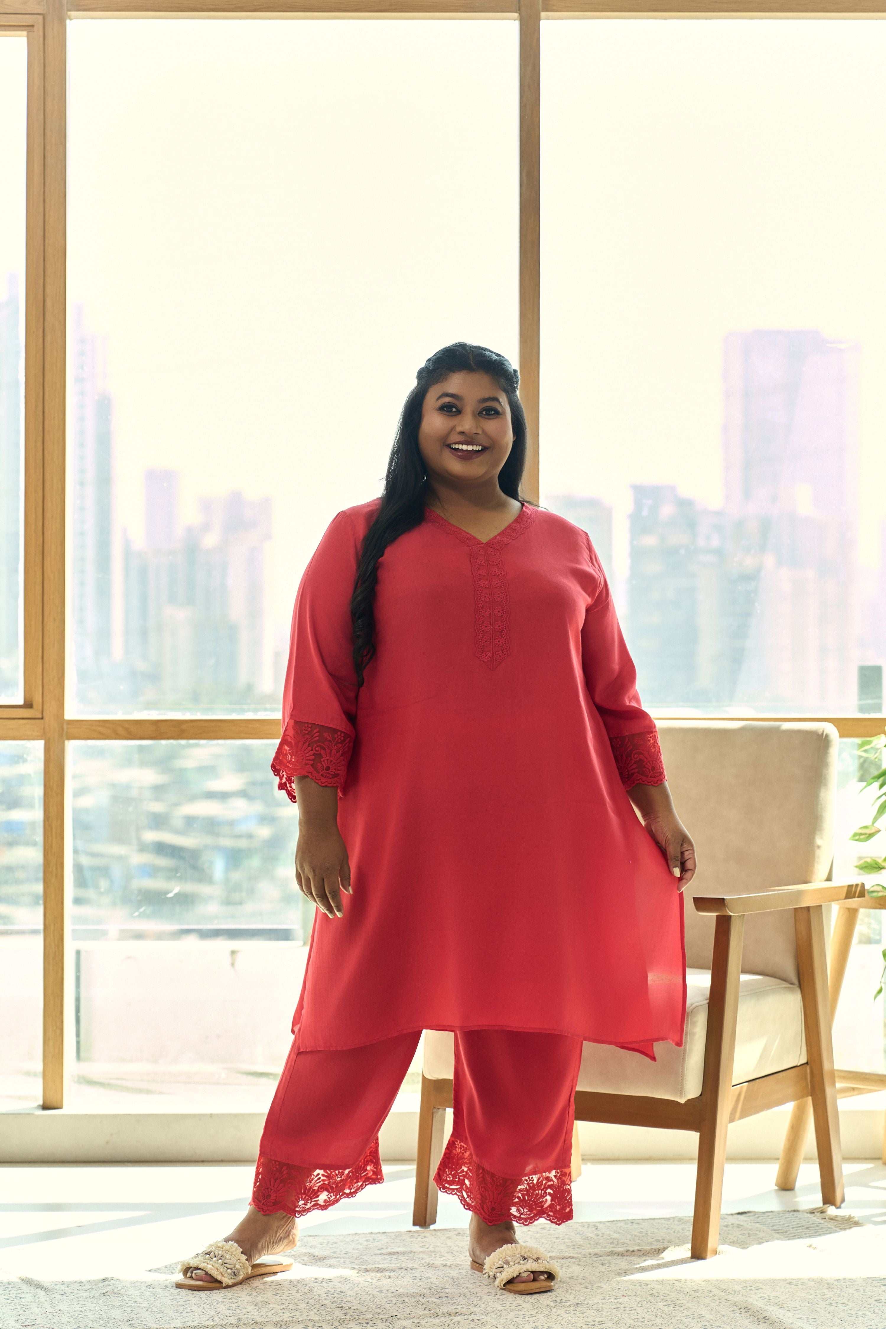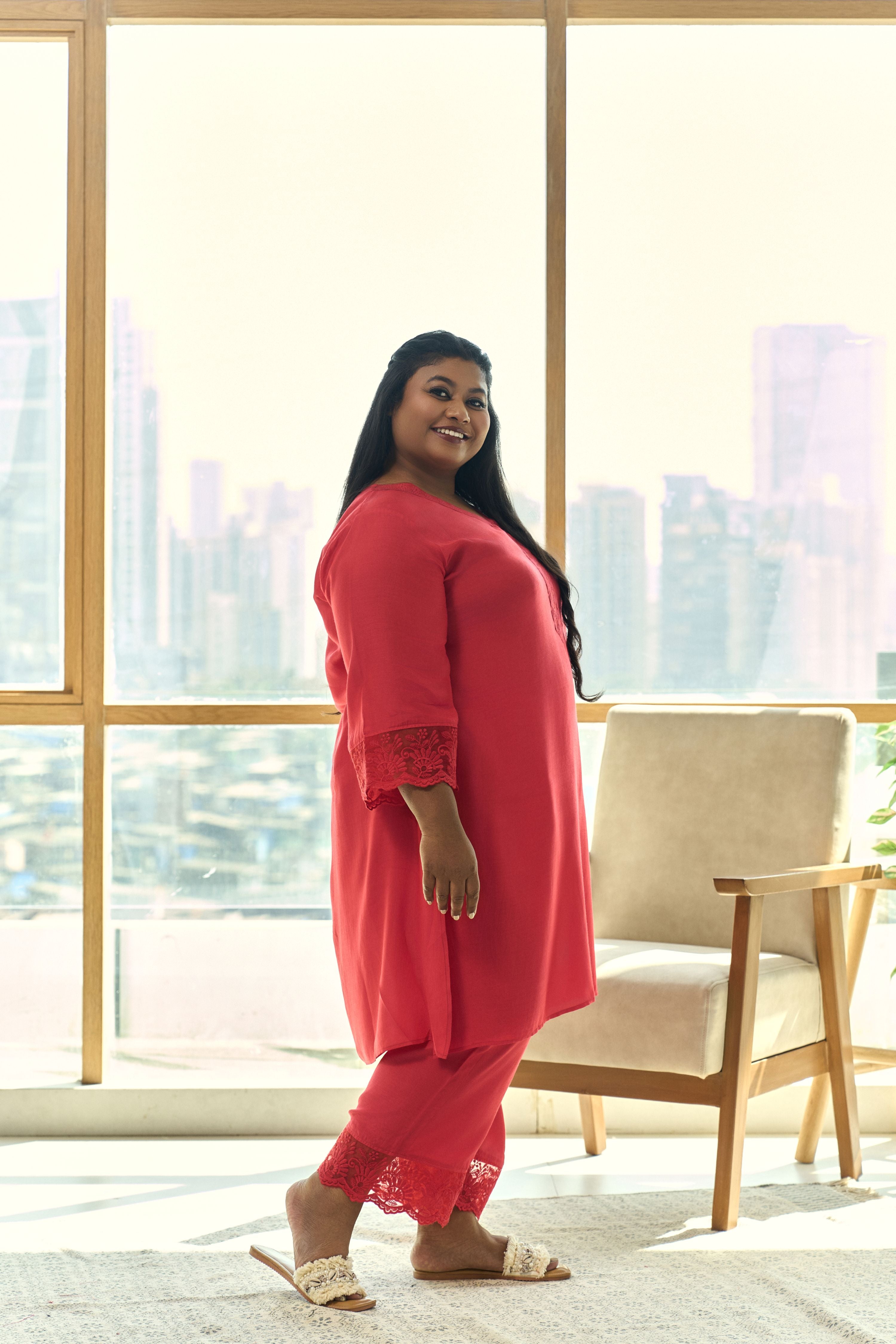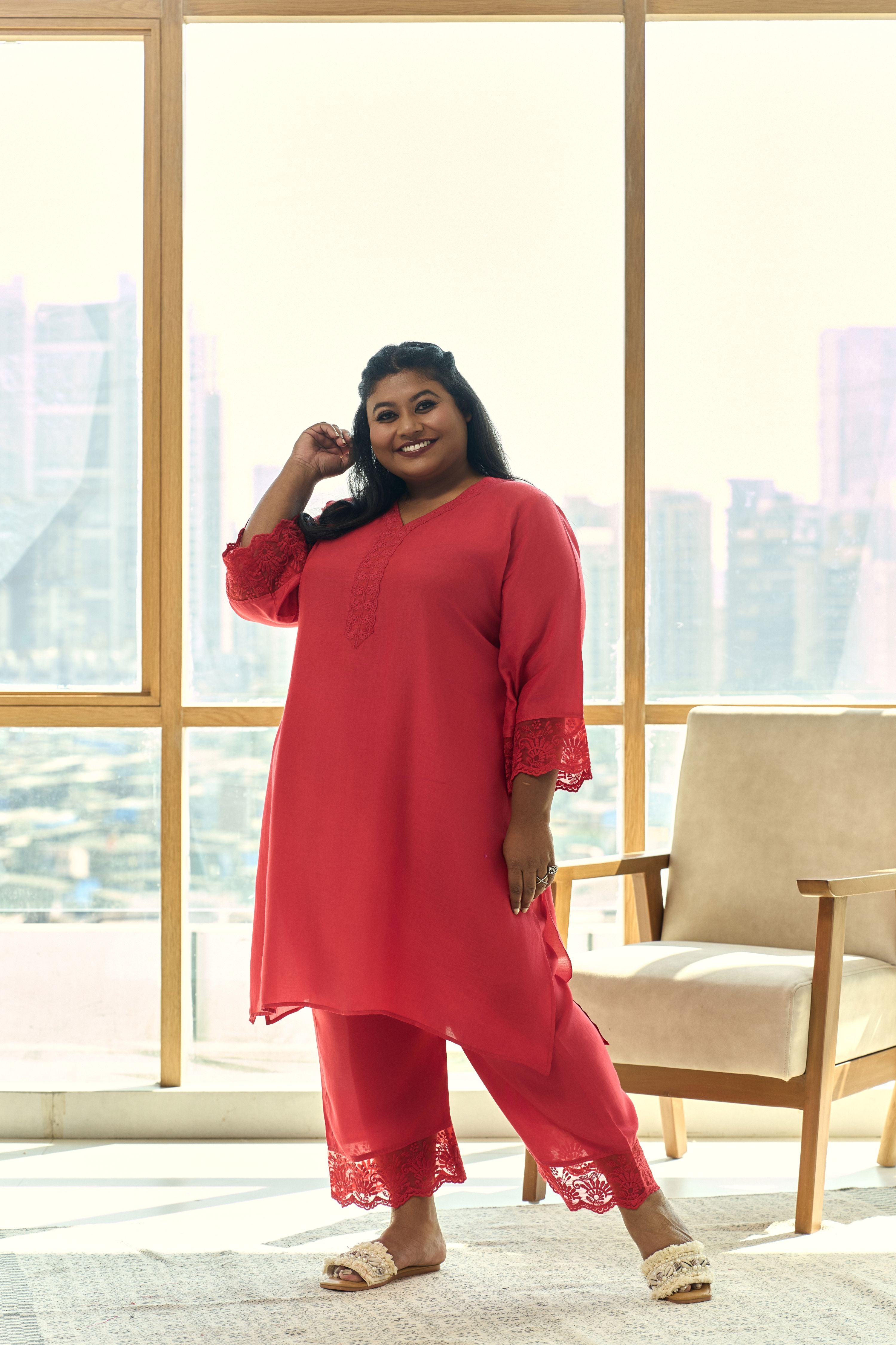 Step into royal elegance with this Red Muslin Kurta Set( set of 2 ), designed with a luxurious sheen and delicate organza lace detailing for a sophisticated touch. Featuring a V-neckline, three-fourth sleeves with lace accents, and a graceful silhouette,