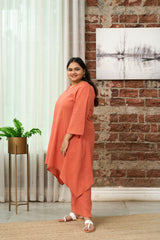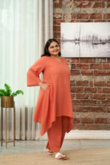 Indulge in effortless elegance with this Rust Orange Cotton Co-ord Set. The asymmetrical tunic, featuring a flattering V-neckline and a modern high-low hem, pairs perfectly with the sleek, elasticated pants for all-day comfortable workwear style.