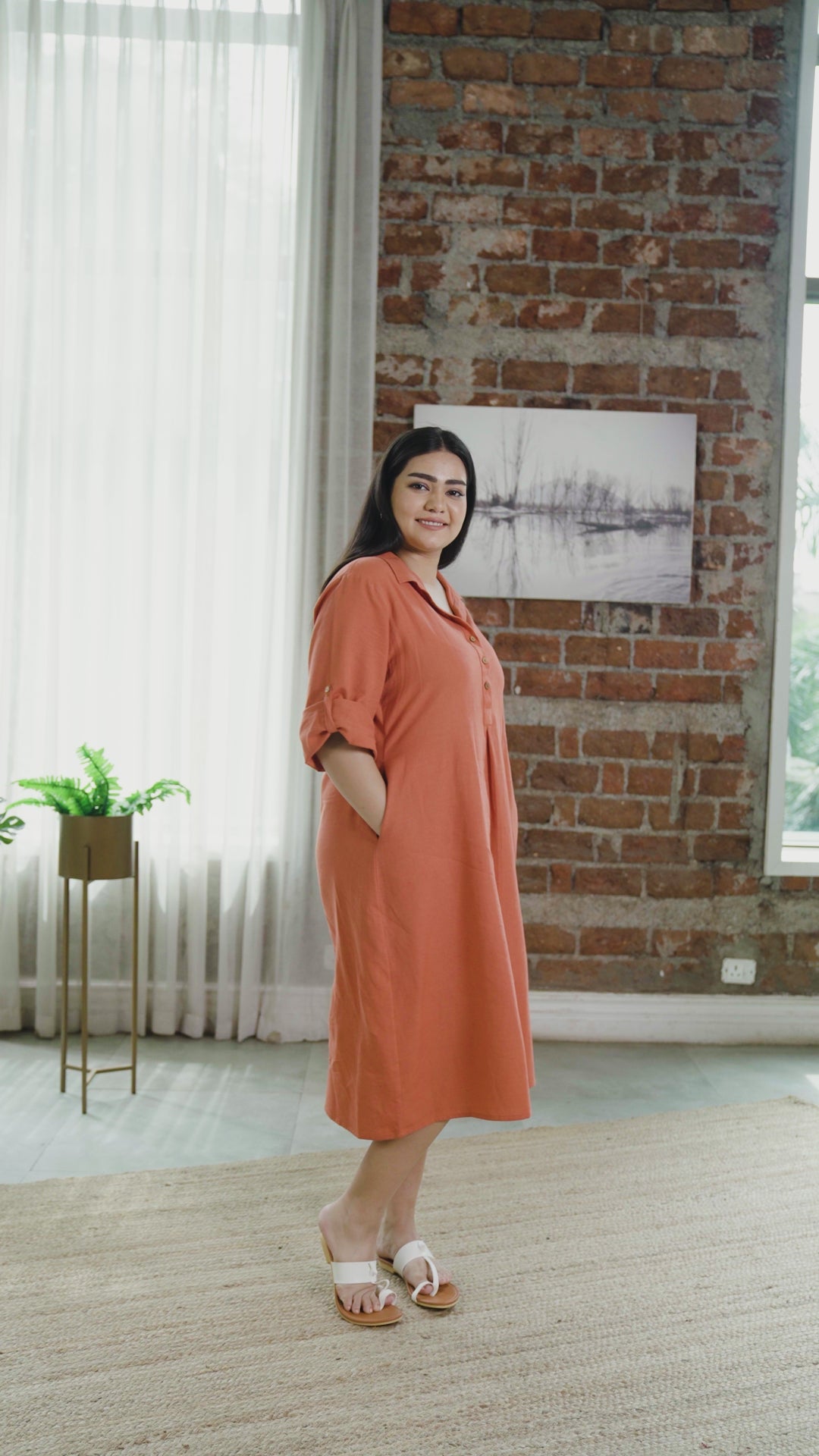 Look effortlessly stylish in this Rust Orange Midi Dress. Perfect for brunch dates or any occasion, this comfortable piece features a classic half-button collared neckline, relaxed sleeves, and a flattering front pleat.