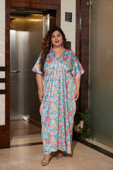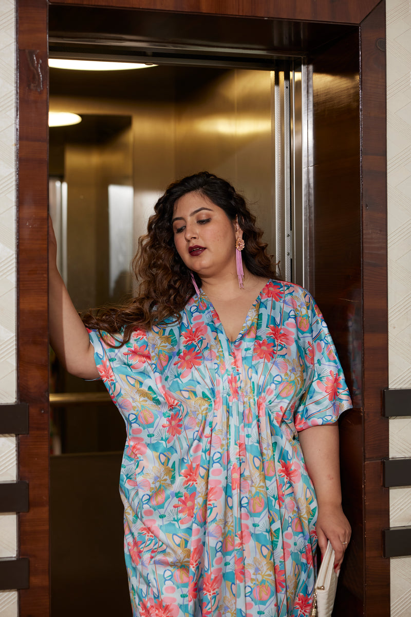 | The dress is made in chich floral print which bright and quirky. This Satin Draped Gown is made in satin with waist detailing. The drapes give the dress beautiful cowls making ti stylish. Head to the parties in this comfy stylish gown!! |