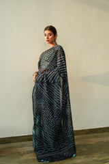A mixture of Bandhani and Leheriya are a must in wardrobe. This Grey Leheriya Bandhani Saree are a win win for the Gen Z people to flaunt their boho look with some oxidised jewellery and make boys head turn.