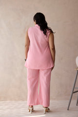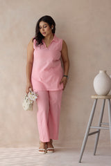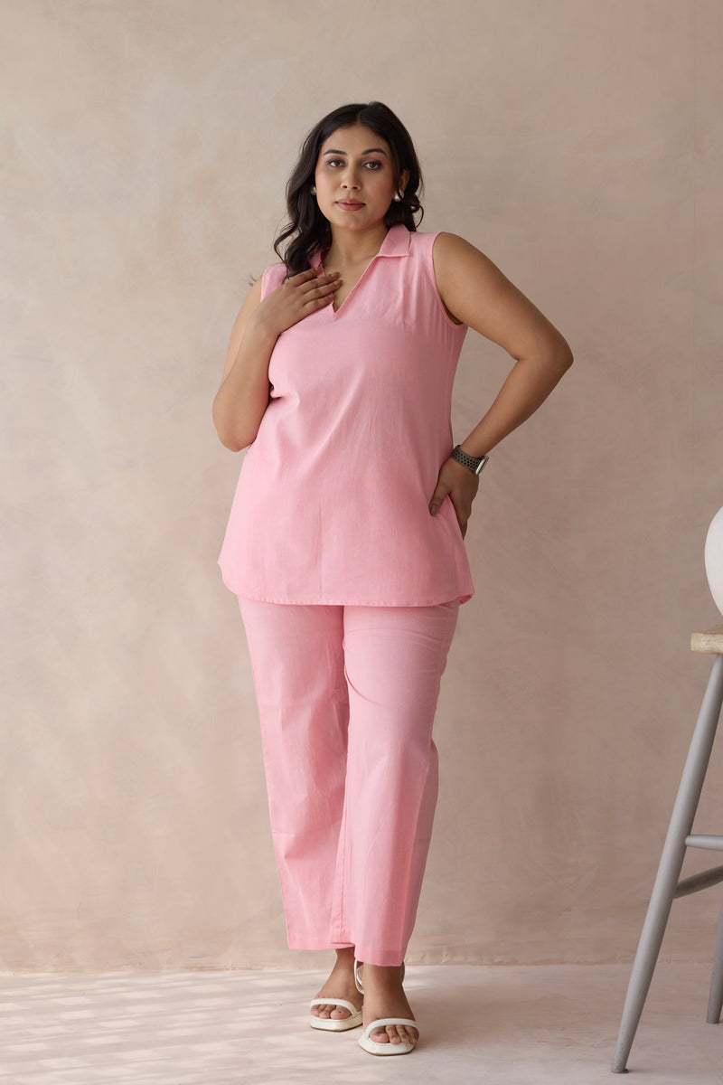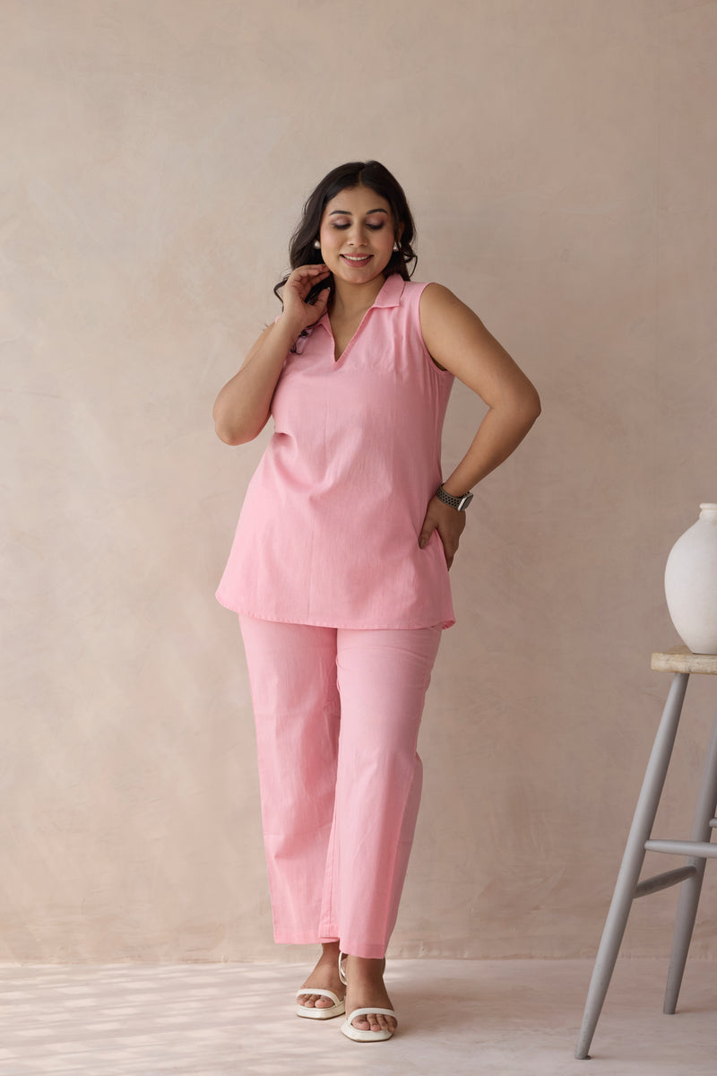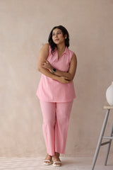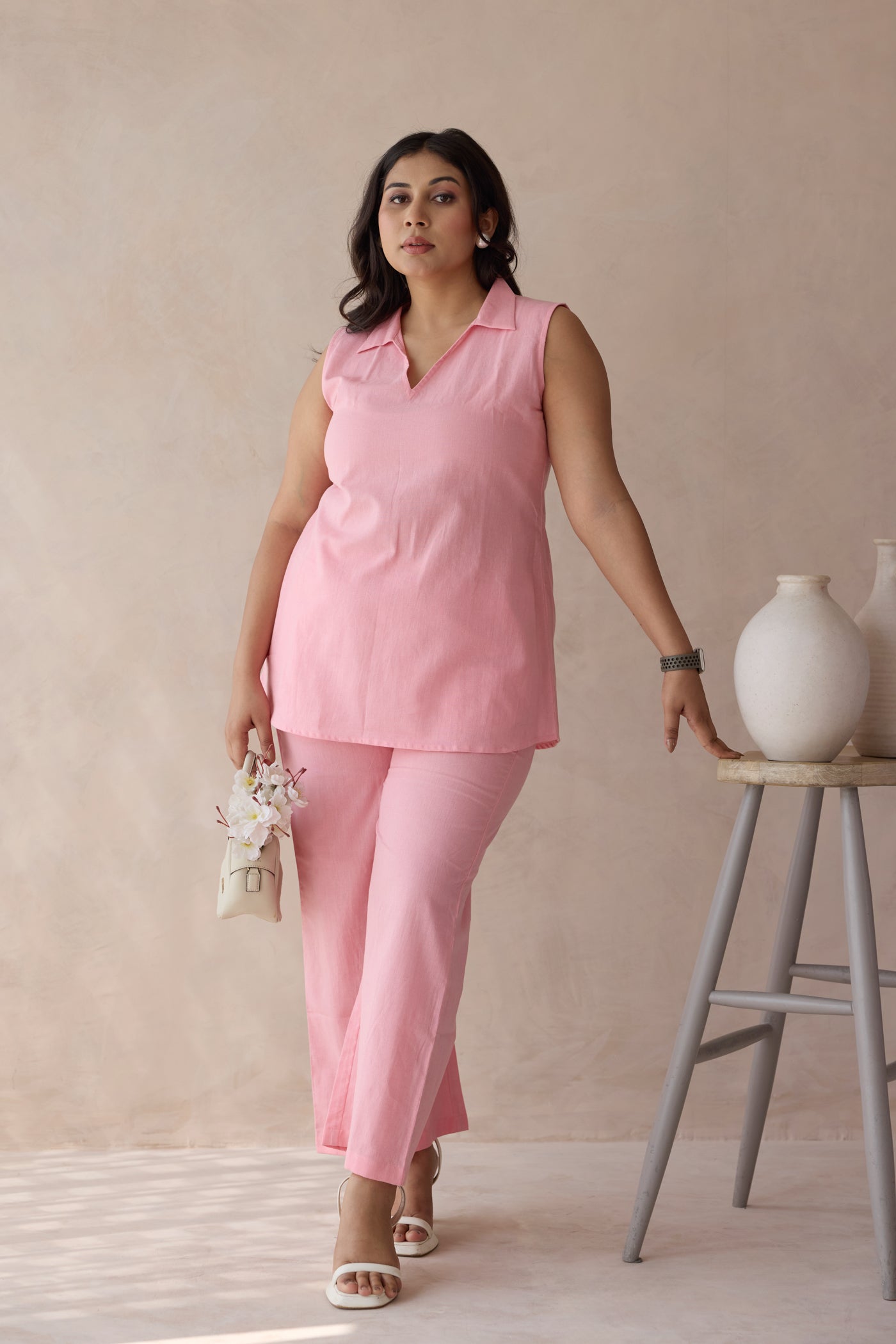 Simple, refined, and thoughtfully designed. Our Solid Blush Pink Co-ord Set is made for the progressive woman who values both style and comfort. Crafted from 100% cotton linen, this set features a sleeveless top with a smart shirt-style collar and a flattering v-neckline for everyday ease. The straight-cut pants offer a clean silhouette and come with two functional side pockets to carry your essentials. Perfect for work, travel, or casual outings, this set is your go-to for effortless sophistication.